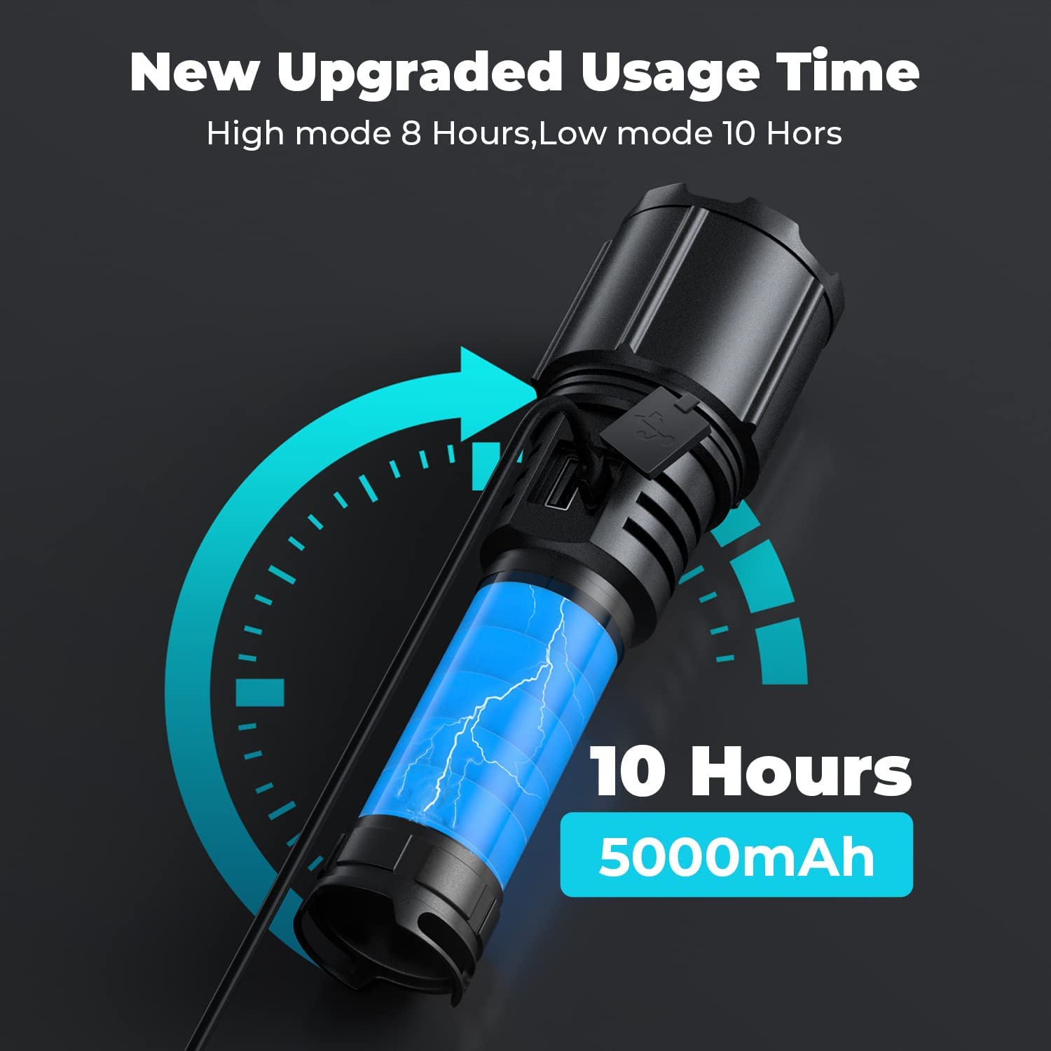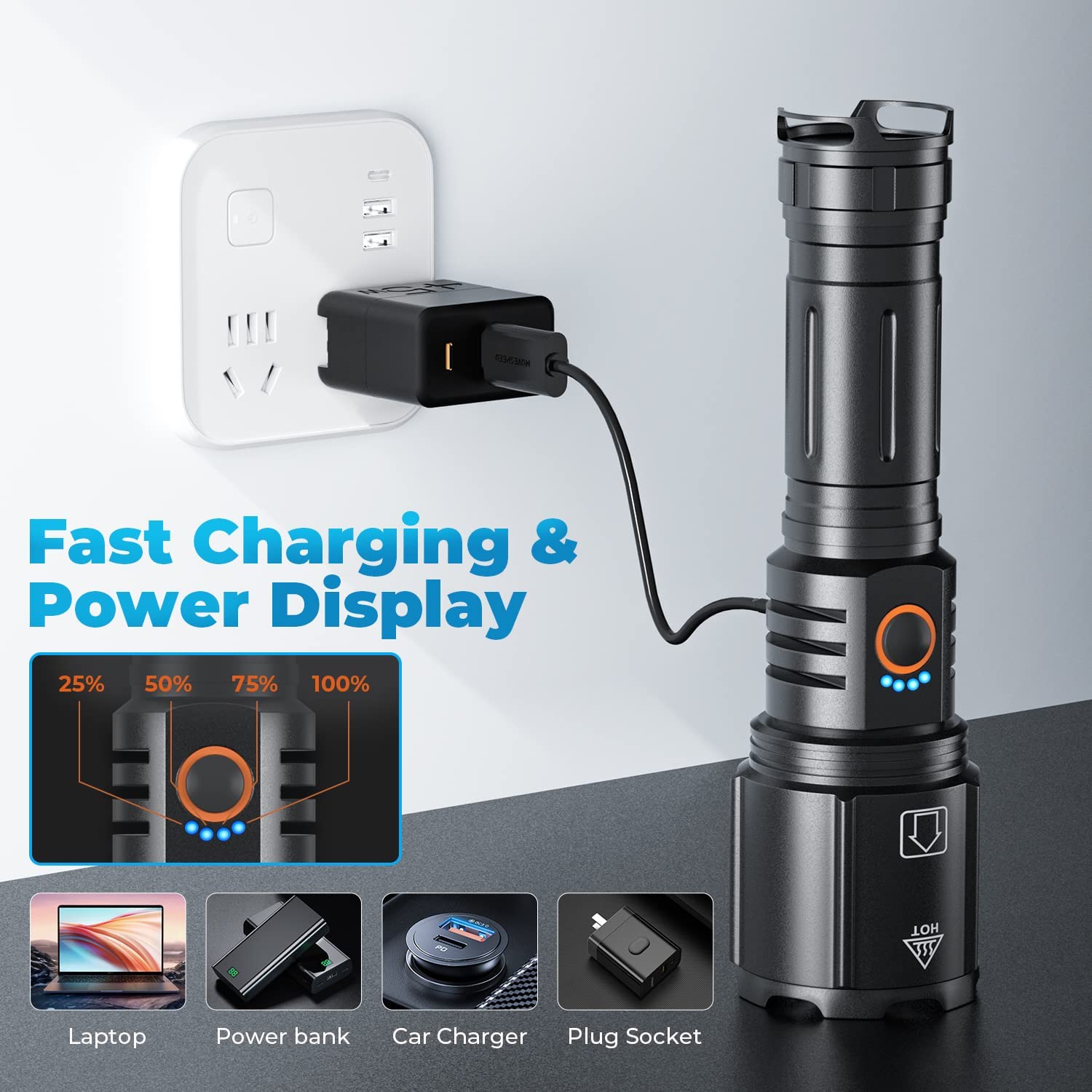 • 【USB Rechargeable & Power Display】2 Pack Rechargeable Flashlights built in fast charging,and comes with 5000 mAh large-capacity power supply,You can experience up to 12 hours of brightness with a full charge.You can see the remaining power of the flashlight and charge it in time.
