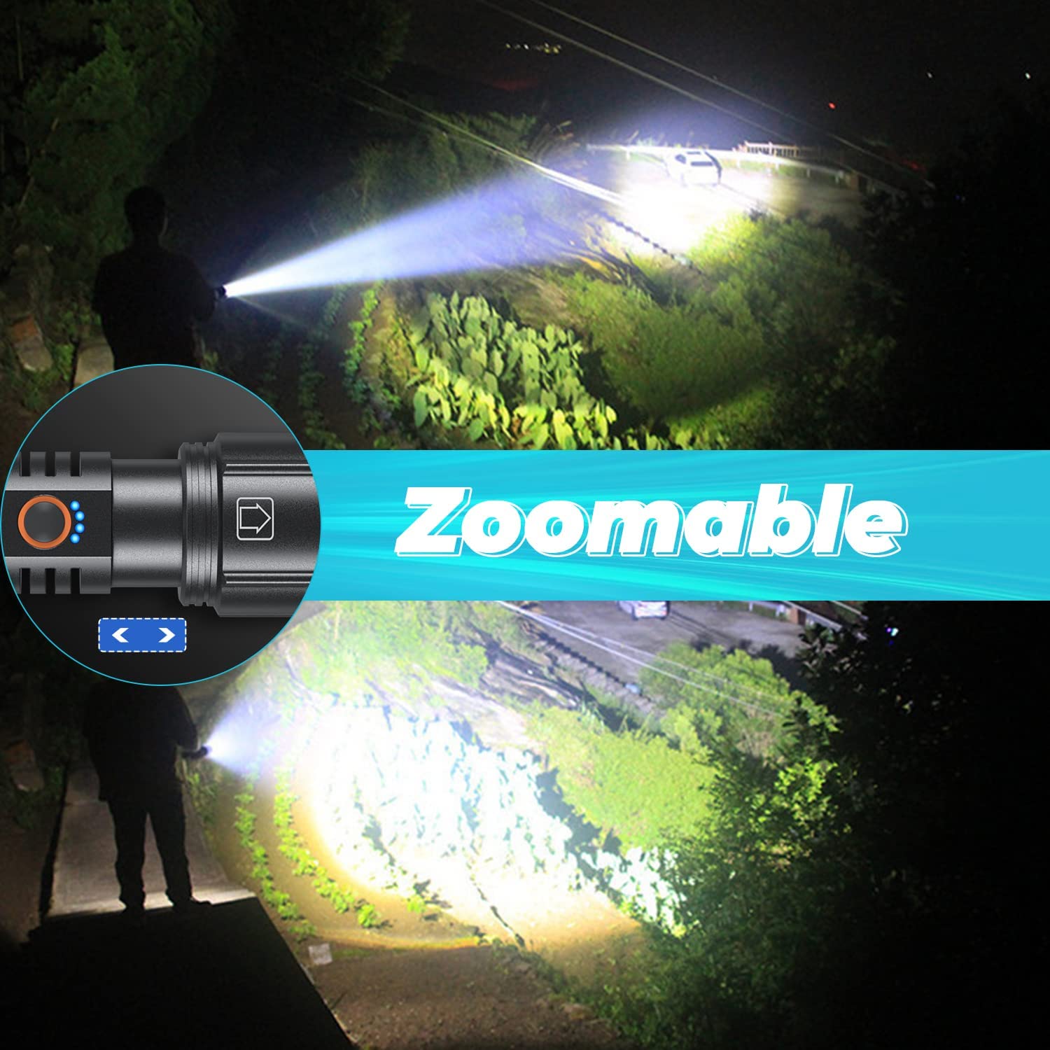 • 【250,000 Lumens Flashlight】The Brightest Flashlight is equipped with an upgraded P70 chip, the maximum output is 250,000 lumens, and the irradiation range can reach 1000 meters. This LED flashlight can not only meet your daily lighting needs,but also suitable for outdoor lighting such as emergency and camping.