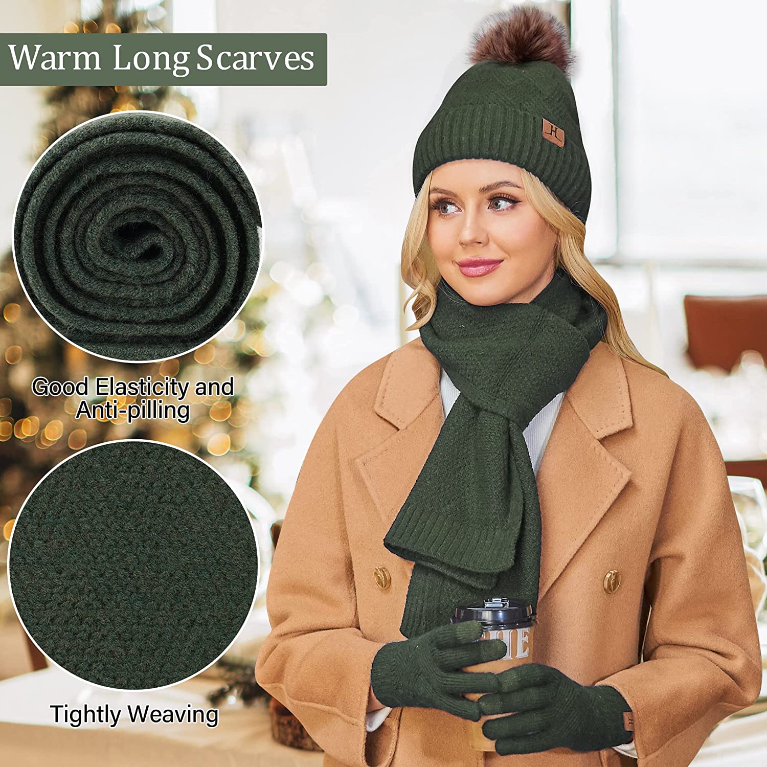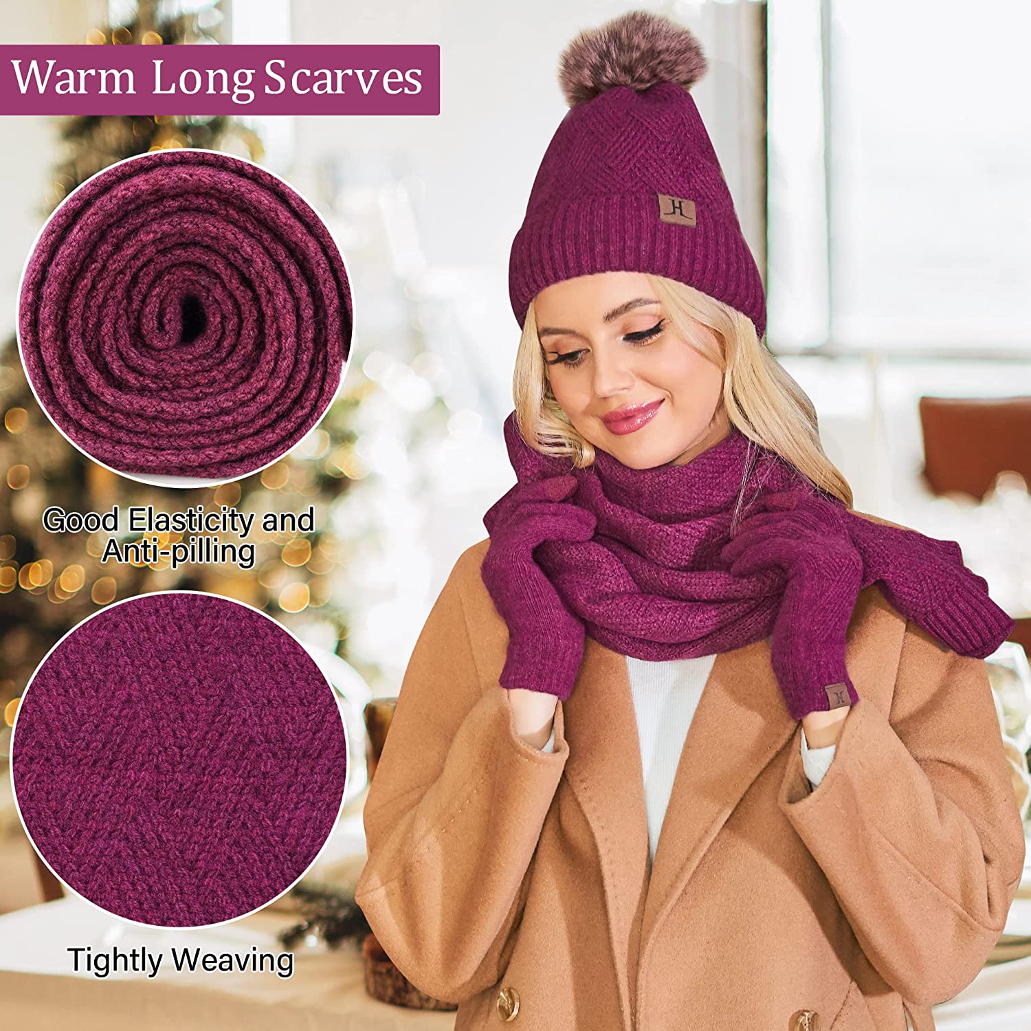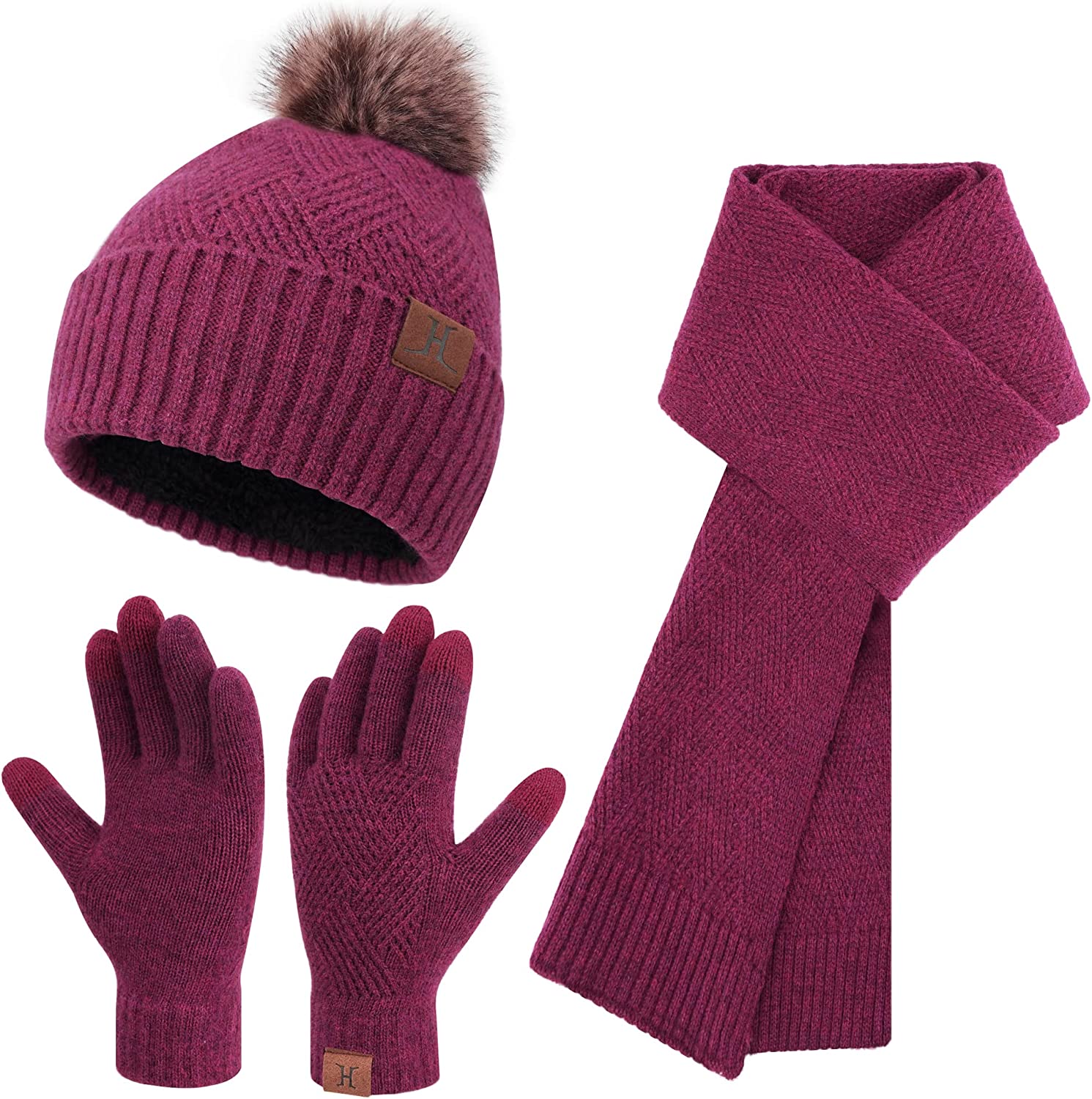 Womens Winter Beanie Hats Long Scarf Neck Touchscreen Gloves Set Knitted Pompom Cap with Thermal Fleece Lined