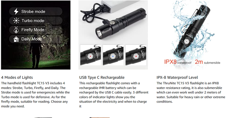 • MODES FOR EVERY SITUATION: Firefly/ Low / Medium/ High / Turbo /Strobe light modes, makes the TC15 perfect for any situation, perfect gear for outdoor activities and adventures.