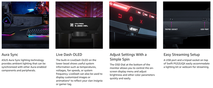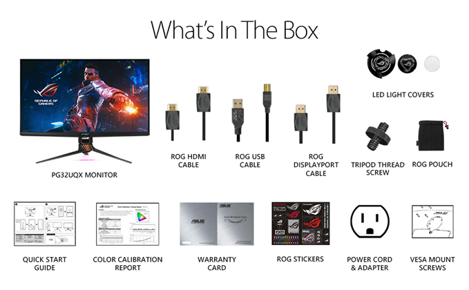 • What’s in the box: ROG HDMI cable, ROG DisplayPort cable, ROG USB-A to B cable, Power cord & adapter, Quick Start Guide, Warranty Card, Color calibration report, ROG Welcome card, ROG Stickers, Tripod Thread Screw, Wall mount screw, tripod screw, Replaceable LED light covers, ROG pouch