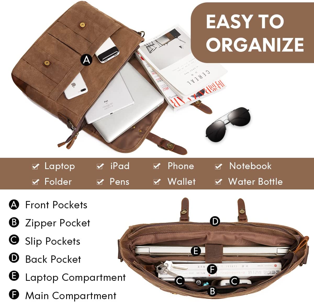 STUDRY & WATERPROOF: The mens messenger bag is presented in high density waxed canvas and genuine leather, crafted with quality solid hardware, durable and functional. Every scrape on surface create a modernized vintage look. The briefcase's dimension is 15.4""L * 4.3""W * 12.2""H, great for college, work or travel.