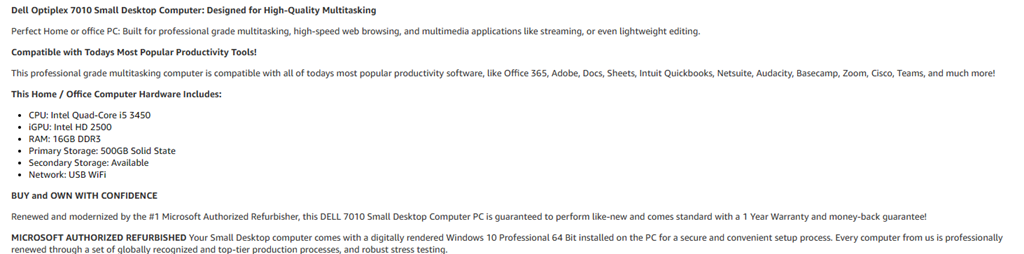 • This computer bundle includes a Dell Optiplex desktop computer, new hard drive, new memory, Wi-Fi, new mouse and keyboard, new power cord, a quick start guide for hassle free setup, and a genuine copy of Windows activated and preinstalled with COA sticker on tower.