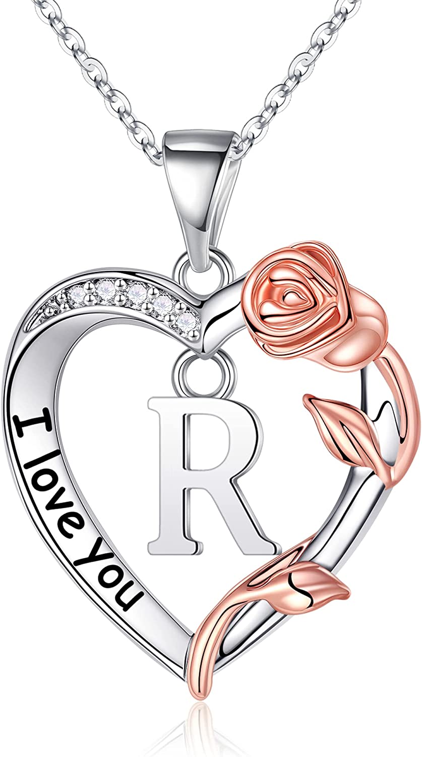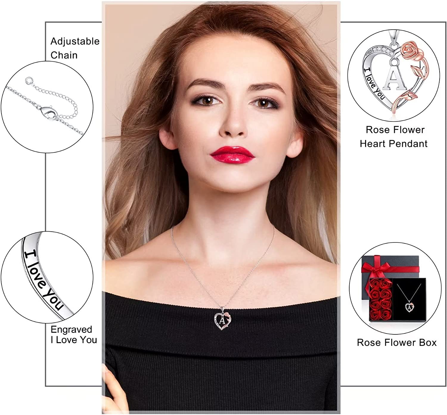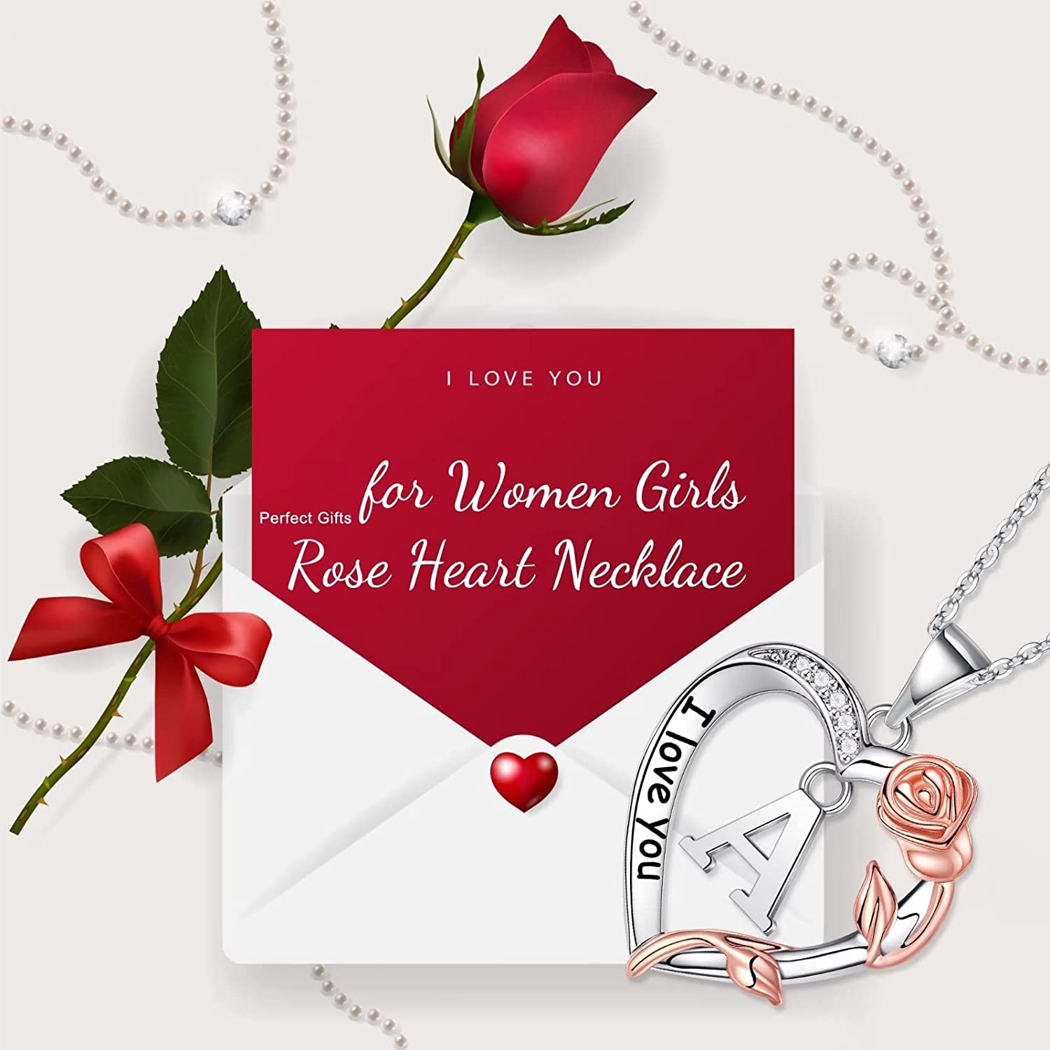 Rose Heart Necklace Gifts for Women Girls, I Love You Rose Love Heart Initial Letter Pendant Necklace Jewelry Mothers Day Valentines Birthday Christmas Jewelry Gifts for Women Mom Wife Girlfriend
