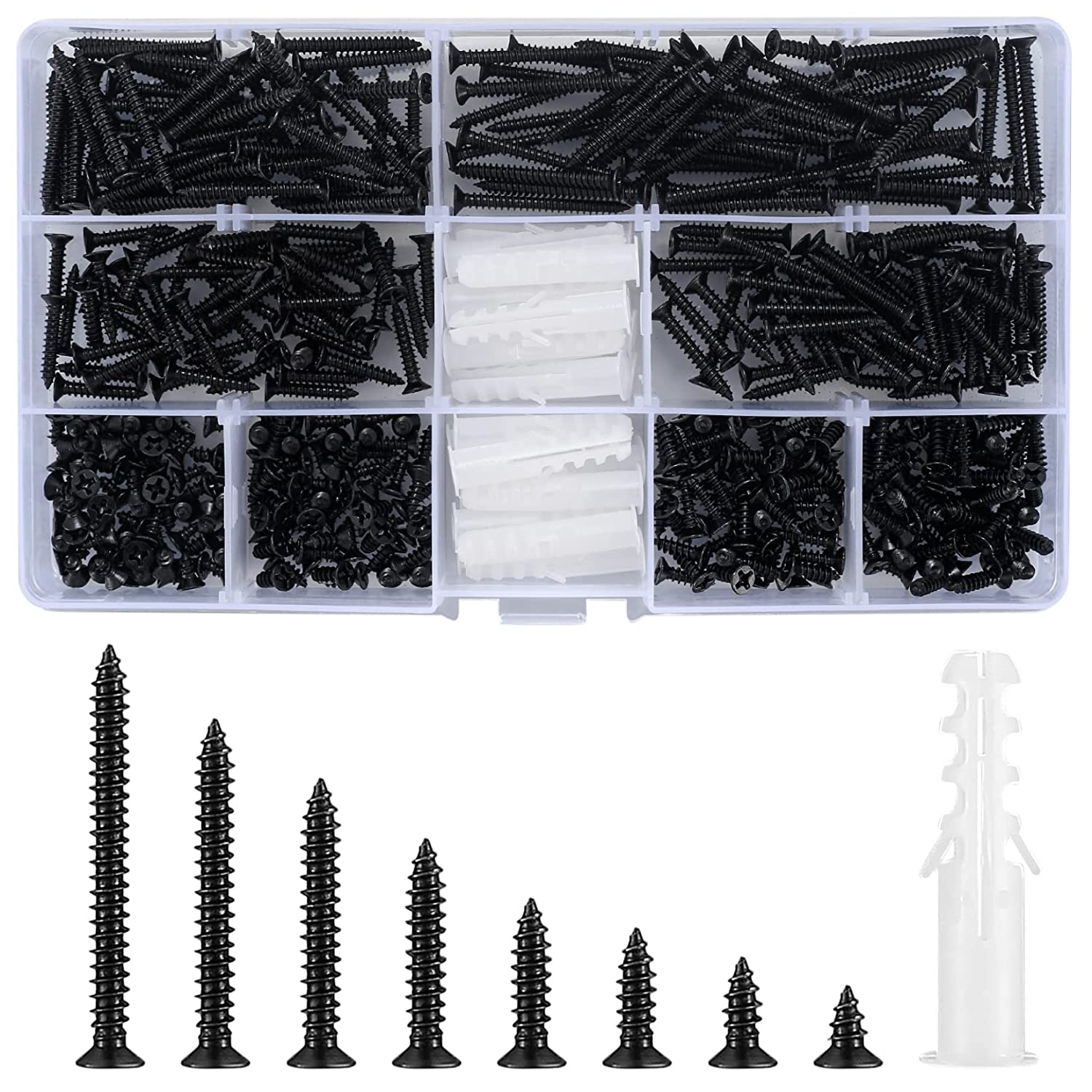 430 Pcs M3 Black Wood Screws Assortment Fasteners Kit, Cross Drive Head Countersunk Head Self-Tapping Screws, Assorted Flat Head Round Head Screws with 20 Pcs Plastic Wall Screw Anchors
