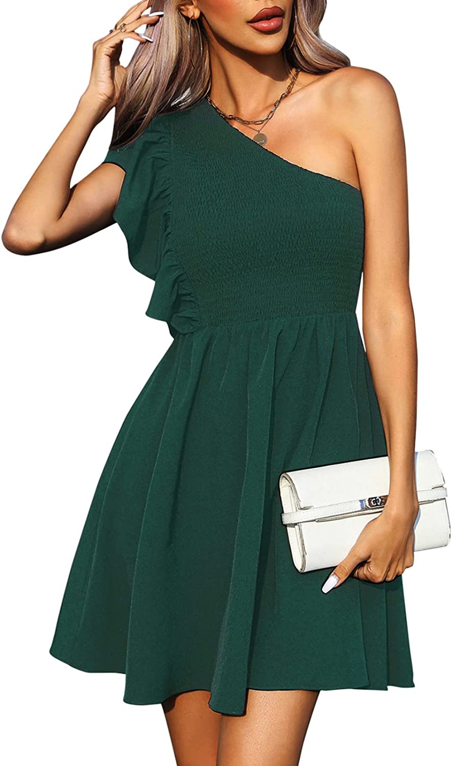 Features: one shoulder, sleeveless, ruffle sleeve, smocked stretchy bodice, high waist, skater dress, lining, solid color, fit and flare mini dress.