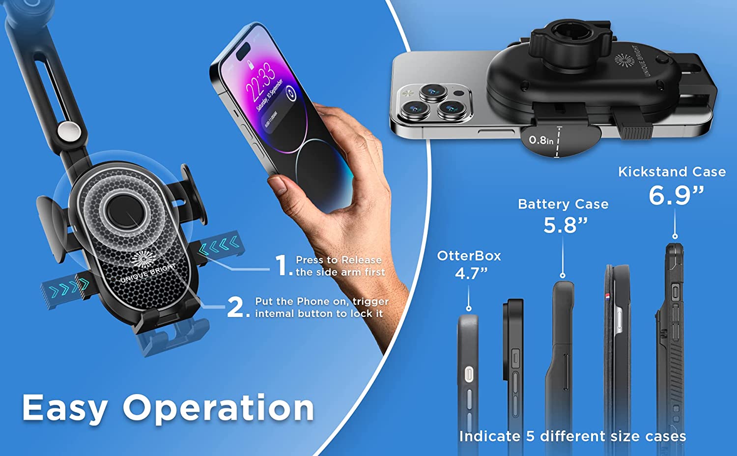 【Widely Compatibility】Sping design allow to clamp for most cars' Rear View Mirror in (Height:2.2"x3.4"),(Thickness:0.8"-2.4"). Phone Holder suitable for 4.5"-7" Phone on the market. Release the Phone holder arm then insert your phone, then press the quick release button to gripped the phones firmly by the sides and the bottom, to held it steady over every terrain you drove over. Easy to mount and operate, even one-handed.