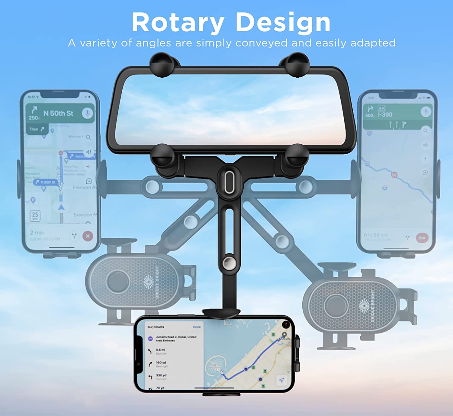 【Free Adjustment Angle】Rear View Mirror clamp designed with a 180° Half Spherical Swivel and Phone Holder with a 360° Adjustment Rod. Support most of your phones either vertically or horizontally over even the roughest terrain. Do Not Like the old style vent-mounted phone holder only be used on a traditional style horizontal air vent and can't be used on vertical or round vents.
