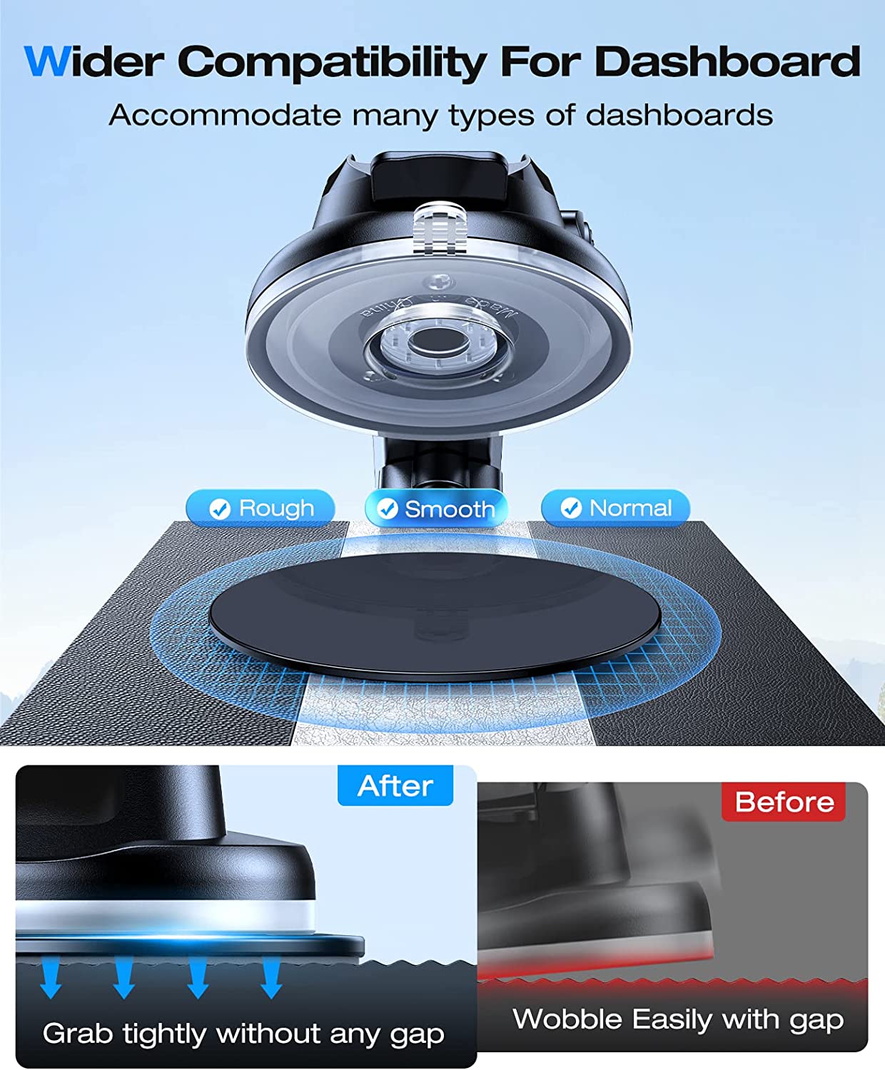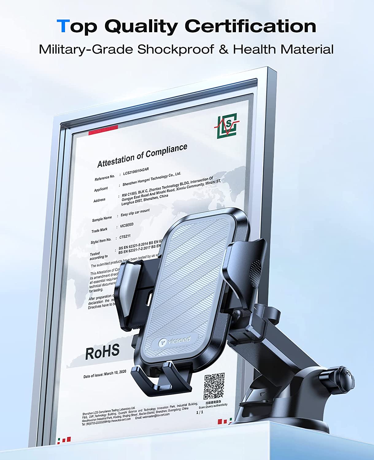 [Strongest Suction Cup, Never Fall Off] Vicseed car mount adopt the latest gen of suction cup with three-layer thickened nano-gel and "Vacuum dual-position locking mechanism" for the strongest adhesion and suction, stable as a rock. Thanks to its Aerospace grade PTFE material, even in extreme environments from -40°F to 195°F, this phone holder for car will not deform, melt or fall off. Also, when you remove the suction cup, it won't leave a nasty mark on your dash or windshield