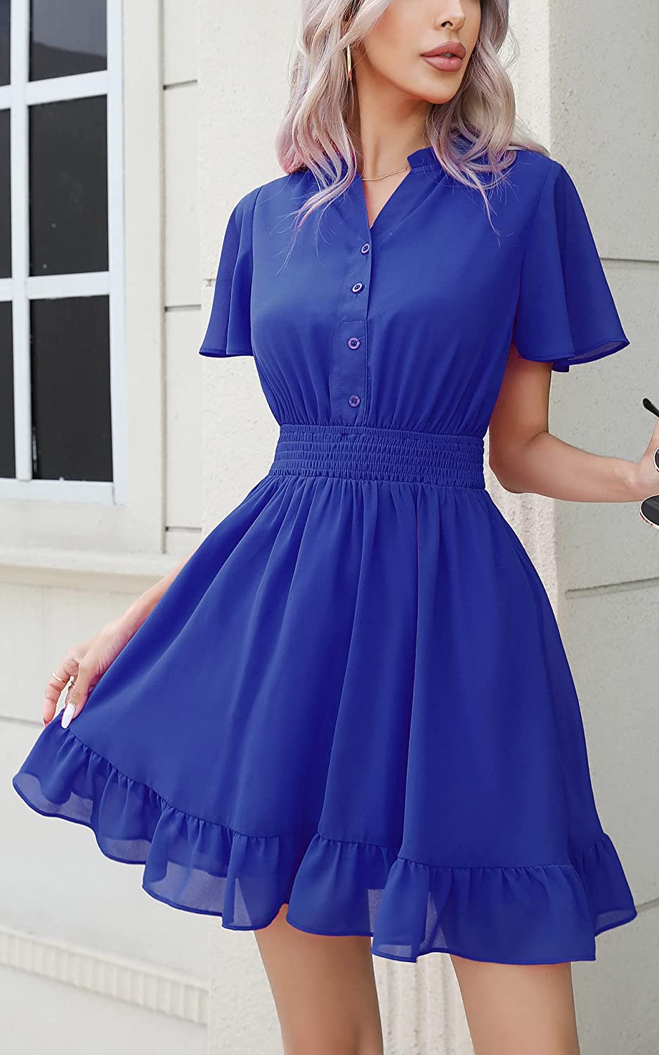 ?Feature: The casual mini dress is designed with gathered neckline and button. Plus, the sheer puff sleeve and the sheer back design adds a bit of charm and sexy to the dress. The dress cinches at the waist with its smocked waistband to accentuate your curve.