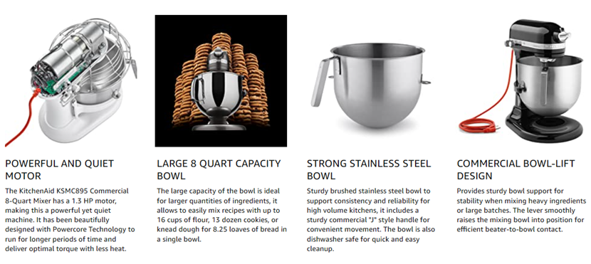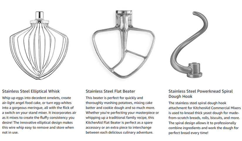 Metal construction, Black in color. Power hub is compatible with all Kitchenaid attachments. Robust metal control knobs. Professional bowl-lift design. Speed control protection. NSF listed. 13-3/8"Wx14-5/8"Dx16-1/2"H. 120V. 1.3 HP. 10 speeds.
