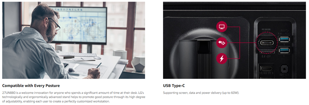 Elevate productivity with flexible workstation and monitor in one. Height, tilt, pivot, and swivel adjustable to help you do your best work. Turn to LG’s 27” UltraFine UHD IPS Display Ergo Monitor to edit photos, create content and design graphics at just the right height — whether sitting or standing. An ergonomic monitor that works hard for professionals looking for an even more proficient workstation, while still delivering an amazing UHD picture, breathtaking clarity, fine detail and accurate color.