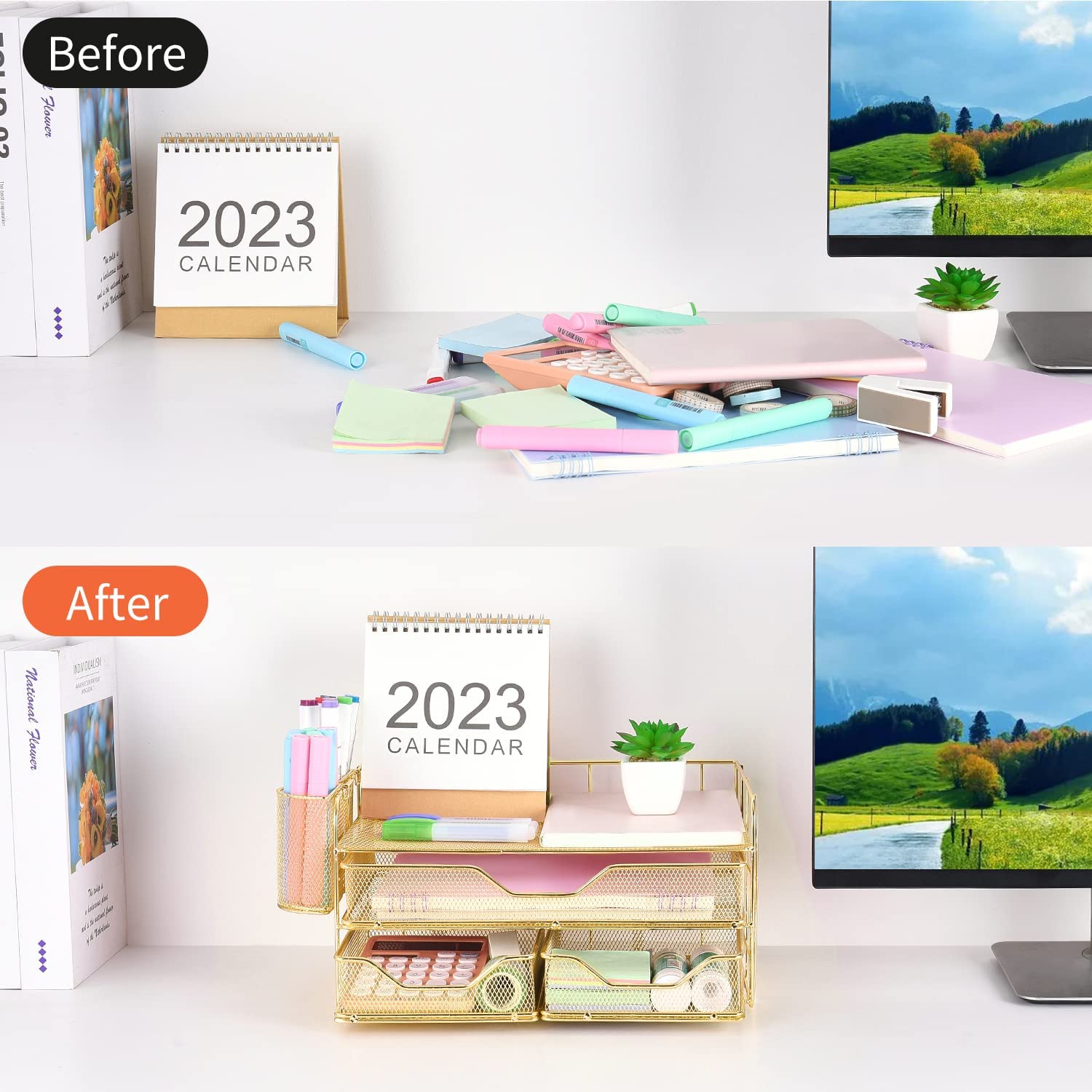 ? [Space Saving]: Desktop organizer provides you with sufficient classified storage space, and everything is within your reach, including post it notes, writing tools, staplers, etc. Use the least space for maximum effect, stay away from messy desks and keep in order.