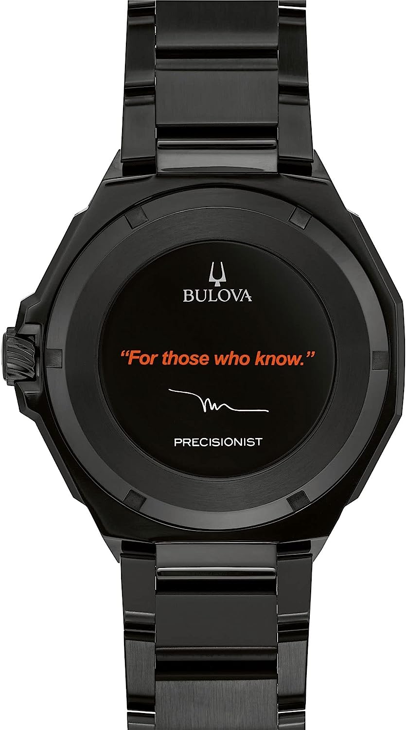 • A translucent aperture in the dial offers a peek behind the curtain at the Bulova Precisionist movement, a revolutionary 8-jewel quartz mechanism accurate to 5 seconds per month, and increased resistance to temperature changes