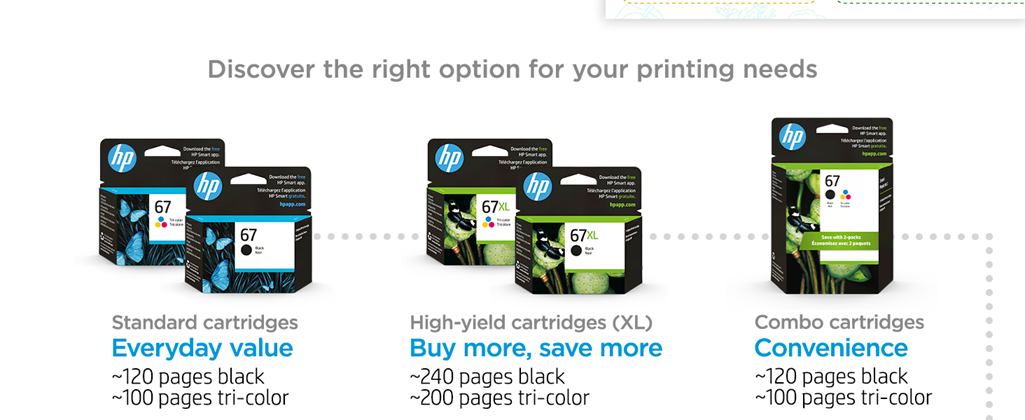 • This cartridge works with: HP DeskJet 1255, 2710e, 2720e, 2721e, 2722, 2722e, 2723e, 2724, 2725, 2732, 2742e, 2752e, 2755, 2755e, 4110e, 4120e, 4121e, 4122e, 4123e, 4130e, 4132e, 4152e, 4155e, 4158e; HP DeskJet Plus 4122, 4132, 4155