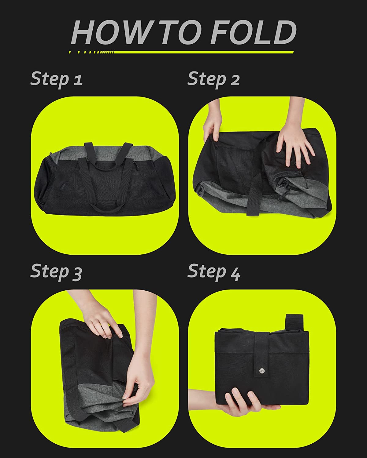 Foldable Gym Bag - The sports duffle bag can be quickly folded into a small package (1/20 of the regular size) and does not take up space when not in use. Lightweight material will not add extra weight burden to tired your after exercise. Durable tear-resistant fabric that can accompany you on every workout.