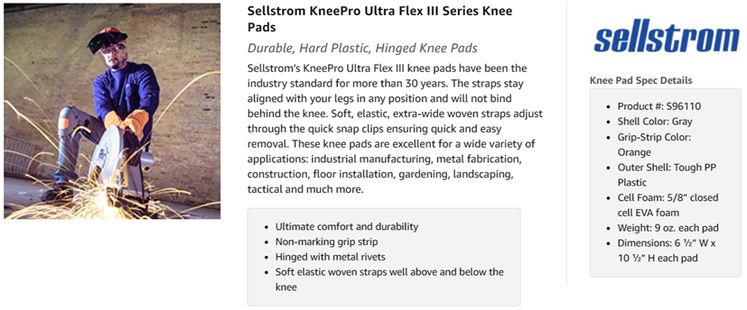 The Sellstrom KneePro Ultra Flex III Knee Pad provides the ultimate in comfort, durability, and protection– whether you need to kneel, crawl, or squat. Pads are designed to protect the patella (the triangular bone that covers the knee joint). The hard plastic outer shell is contrasted with the interior soft padding that has a 3/4-inch closed cell foam pad. Padding is lightweight and comfortable for all-day use. Speed clip closure allows for quick attachment and is adjustable for a custom fit for both men and women. The orange gripping strip provides security and traction without leaving any marks or residue behind. Metal rivet hinge assures easy movement and flexibility. Elastic woven straps have reinforced sewn ends and are attached above and below the knee, so there is no pressure behind the knees. Sellstrom KneePro Ultra Flex III Knee Pads come as a pair of 2 with a mesh drawstring bag to take on the go. Founded in 1923, Sellstrom Manufacturing Co., is one of the oldest American brands of safety products. Today, we are synonymous with the best in head, eye, face, hearing, knee and welding protective products that deliver safety, productivity, comfort and peace of mind.