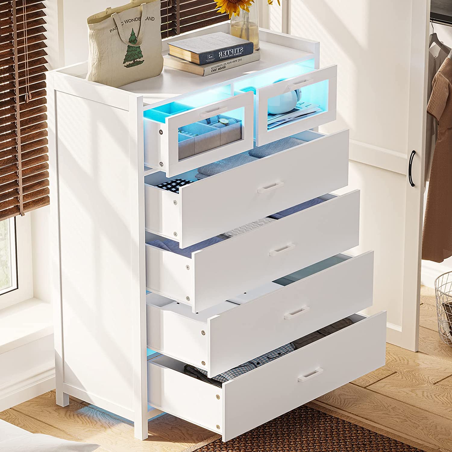 【Unique Visualizing Drawer Design】VIAGDO white dresser has 6 large drawers. The top visualizing drawer combines elements of wood and glass to not only display what you like, but also insulate dust for cleaner and more convenient; Equipped with colorful LED light strips add a soft and warm atmosphere to the bedroom dresser. Make the bedroom dresser more unique and attractive.