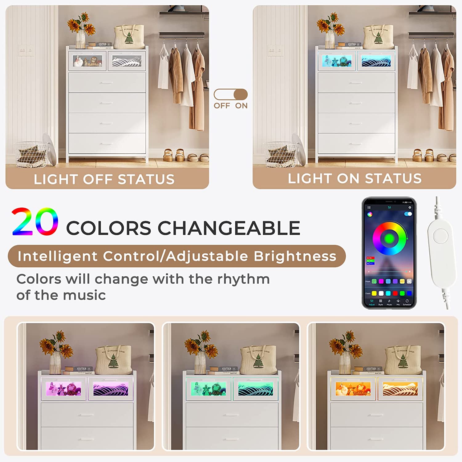 【Multiple Lighting Modes & Brightness Adjustable】The 6 drawers dresser is equipped with LED light strip with more than 20 color modes, and you can control its color with a mobile App or button. Connected with Bluetooth, the LED light strip can freely switch colors according to the music rhythm. You can choose the color you like according to your needs and scenes.