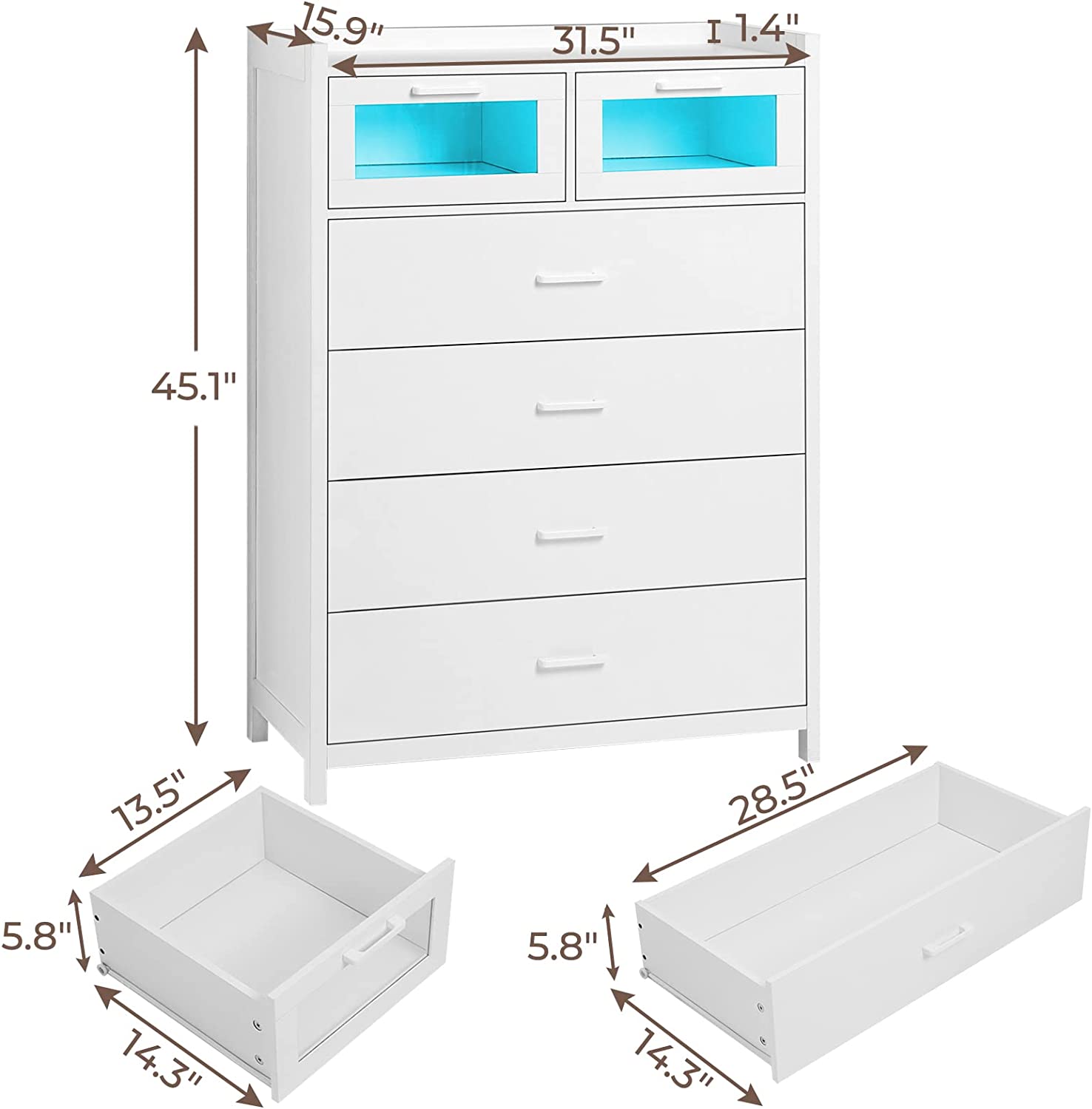 VIAGDO Dresser for Bedroom, Chest of Drawers with LED Lights, White Tall Dresser with 6 Drawers, Wood Large Capacity Storage Cabinet for Nursery, Kids Room, Entryway