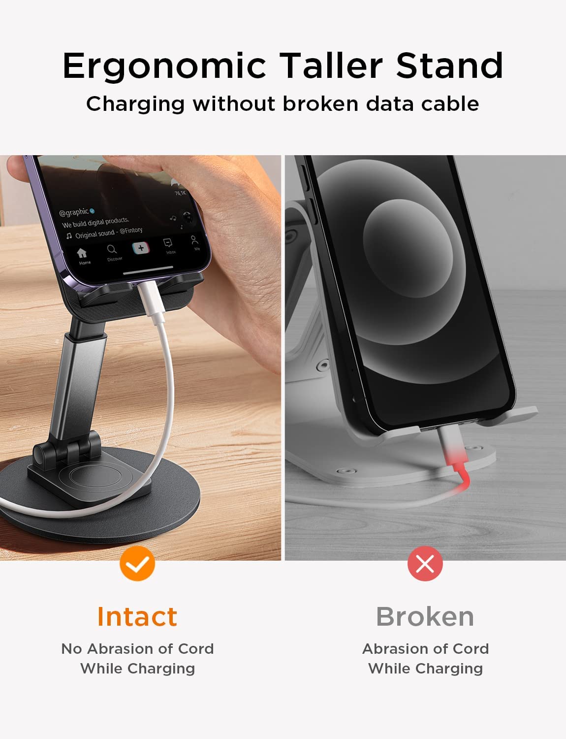 • Data cable friendly. The folding stand is tall enough to avoid bending the charging cable. It perfectly solves the problem that the traditional triangle stand will bend the data cable and cause the interface to break. This stand can free your hands to watch online classes, do live streaming while charging.