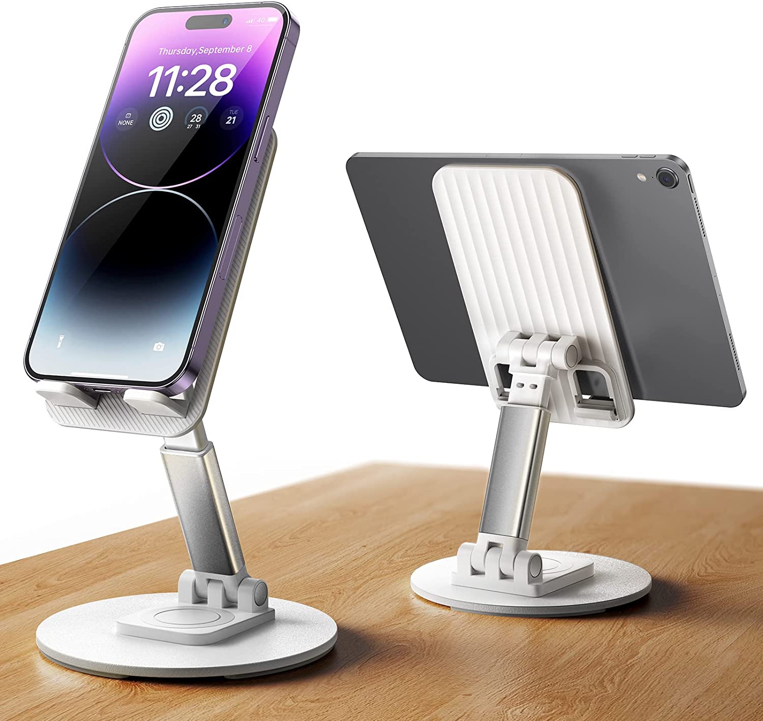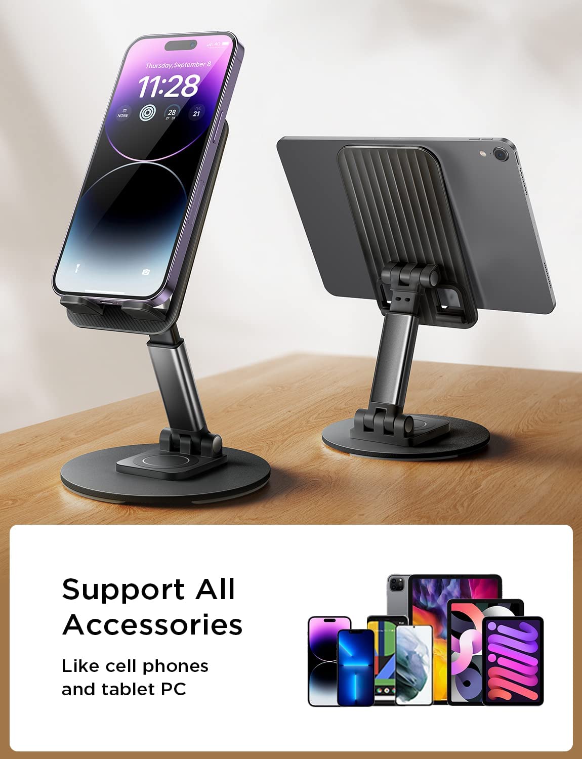 • WEIGHTED ANTI-SLIP BASE: This cell phone stand for desk is equipped with a weighted base and an aluminum alloy rod. Therefore, this iPhone stand holder is stable enough to support all smartphones or small tablets, such as 2021 iPad Mini, iPhone 14 pro max 13 Pro/13 Mini/12/12 Pro/12 Pro Max/12 Mini/iPhone 11/11 Pro/Max/X/MAX/XR/8/8P, Samsung Galaxy S21, S20, Note 10/9/8/Plus, S10/S9/S8, Kindel, Switch, iPad Mini,iPad Air, etc.We recommend the most stable compatible device size is 4-11 inchs