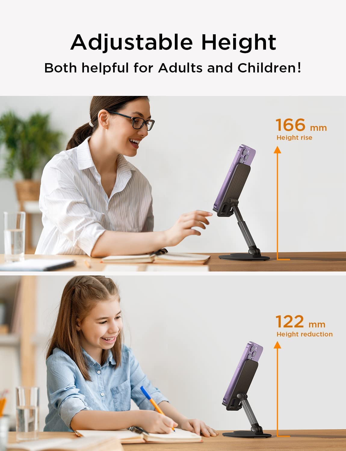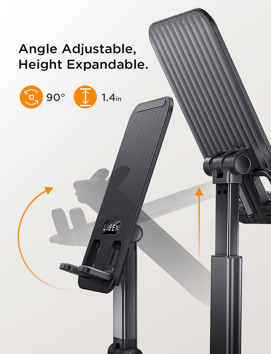 • Taller and more photogenic stand, no more double chins in the camera. This phone holder is ergonomically designed to provide you with a comfortable angle to use and reduce neck and back fatigue. Moreover, the height can be easily adjusted between 5.1 and 6.2 inches, and the angle can be adjusted between 5°and 85°.