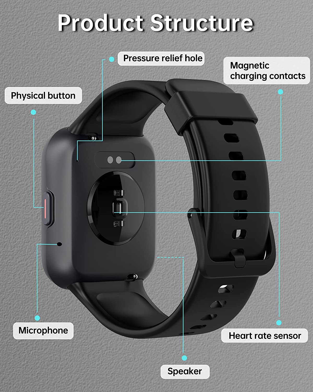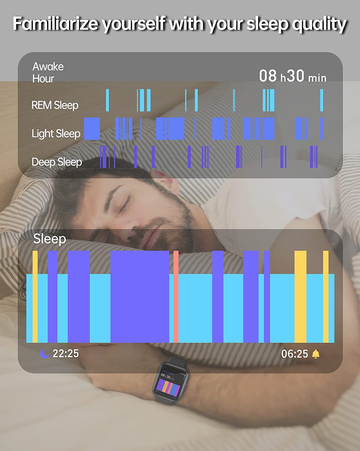 • 【Health & Exercise Monitoring & Gadget】 Track your health, including heart rate, blood oxygen saturation, sleep status and stress levels. Monitor daily steps, calories burned, distance. Choose one of the 60 exercise modes to record your workout data. If your heart rate is too high, the smartwatch will warn you and help you adjust the intensity and duration of your exercise. There are practical gadgets, such as pedometer, drinking water reminder, women's menstrual cycle record, weather, flashlight, music control, find phone, etc.