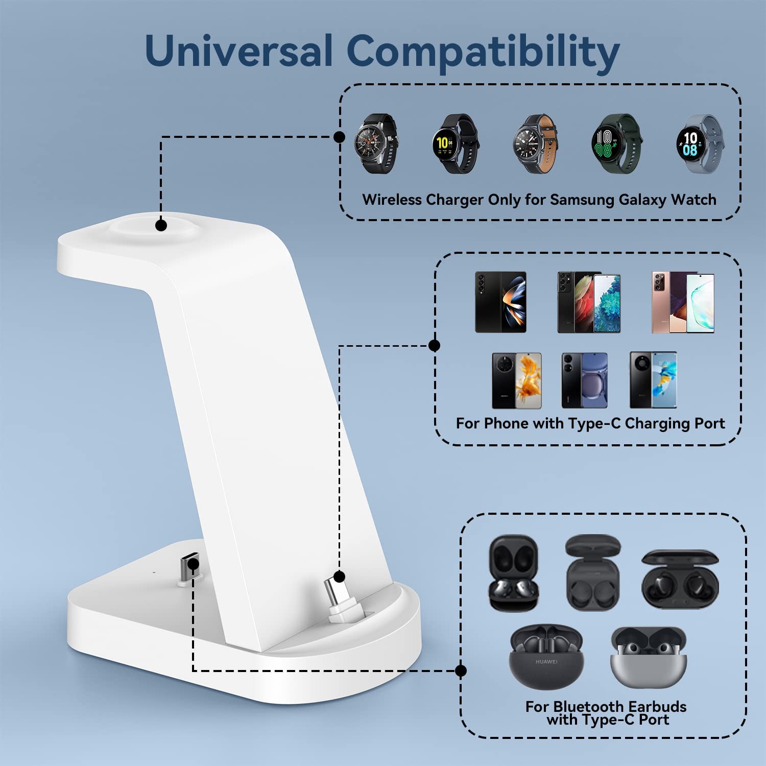 【Better Compatibility】This DUMTERR multifunctional charging station can adapt to more mobilephone models than general wireless chargers. Not only for Samsung Galaxy S22/21/20, but also for most Android phones. This charging station has a built-in TYPE C charger interface, which can charge any Android phone and Bluetooth headphone with Type-C charging port.The Wireless charging dock of charging station is only for Samsung Galaxy Watch.
