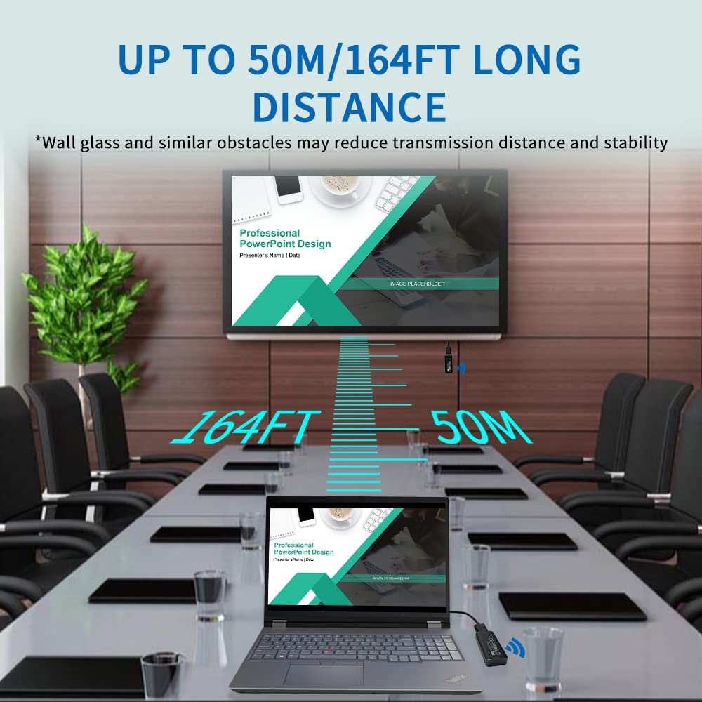 - Wireless HDMI Transmitter and Receiver Transport 50m/164ft: Wireless HDMI Extender in an open field, offers a transmission distance of up to 50 meters (Suggestions for use: For a better experience, try to use the product in the same room and avoid large obstacles in the middle of the product to avoid interference with the signal.)