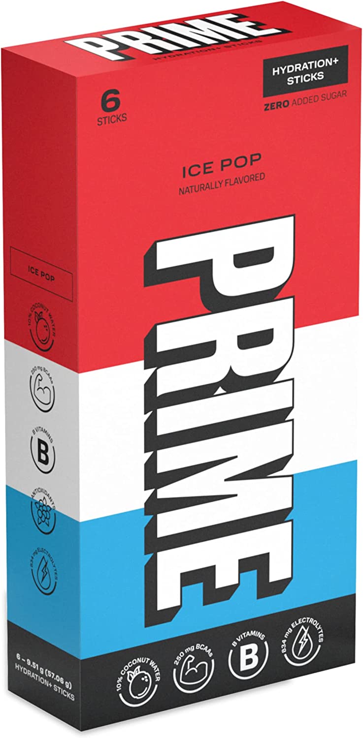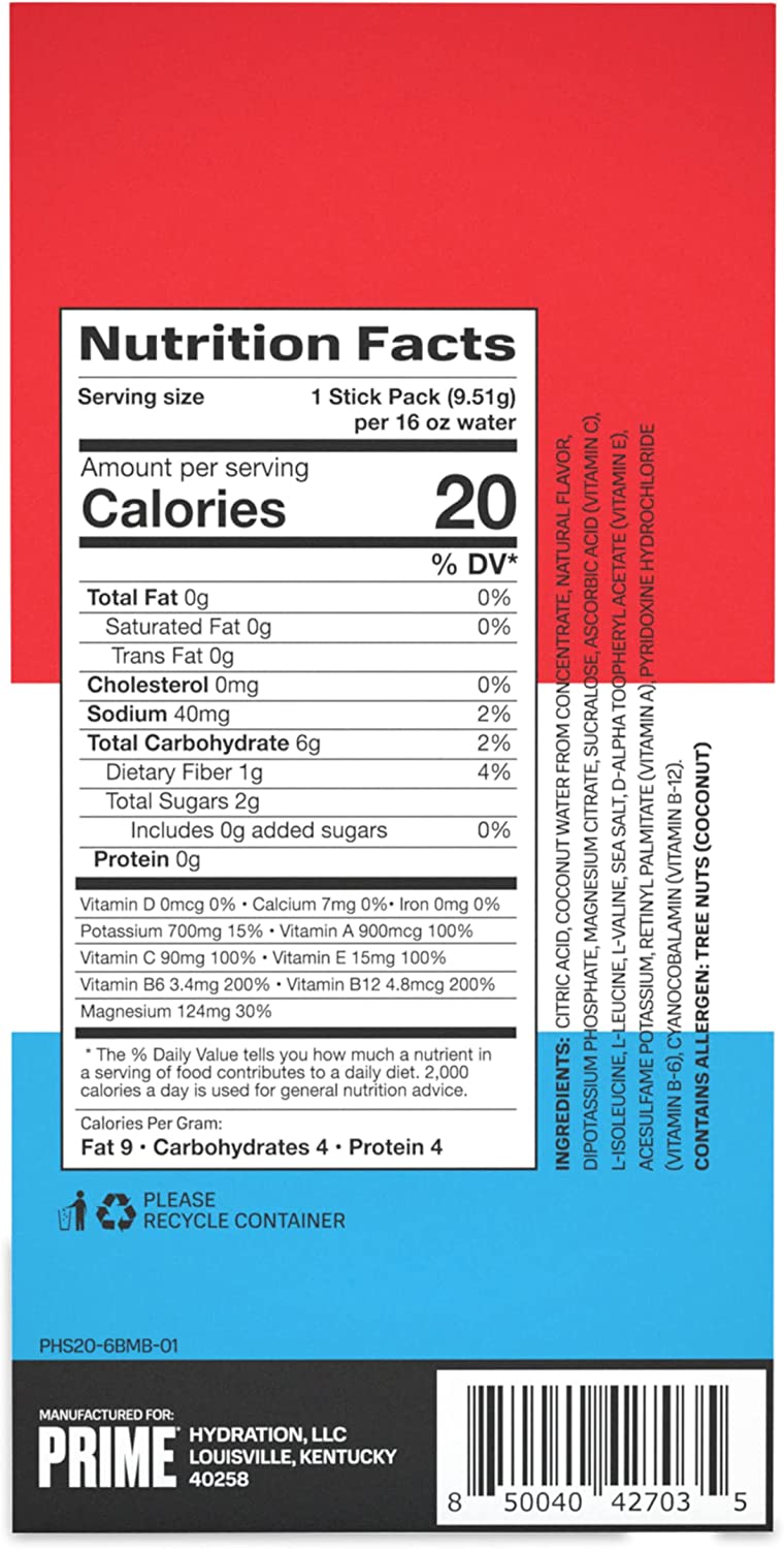 Prime Hydration+ Sticks are only 20 calories per serving with zero added sugar, 250mg BCAA, 834mg electrolytes, B vitamins, antioxidants, and 10% coconut water