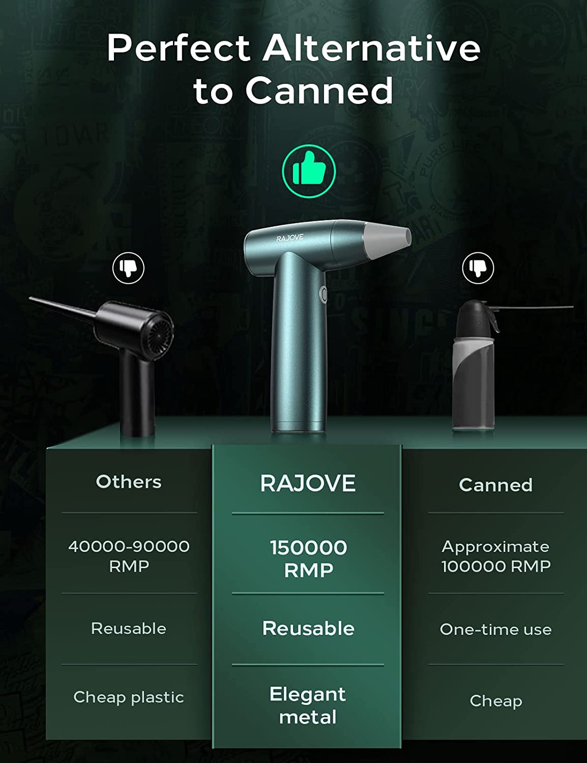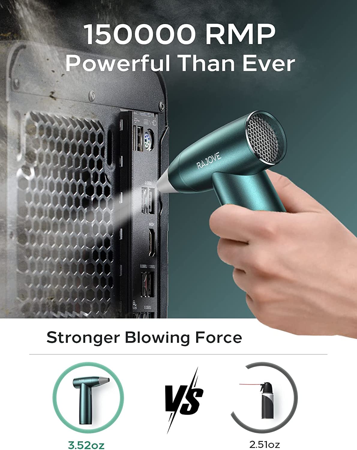 - [More Efficient Dust Removal] As you know, the canned type need to be replace constantly and the ordinary rechargeable air duster is not stronger enough for dust removal. RAJOVE air duster compressed air provides you the perfect solution. By adopting an innovative coreless & brushless motor, it provides 90% stronger blowing force than the ordinary, the motor speed is up to 150000 RMP while reducing the power consumption down to 20%! Make the complicated dust removal job easily done in 1 minute!