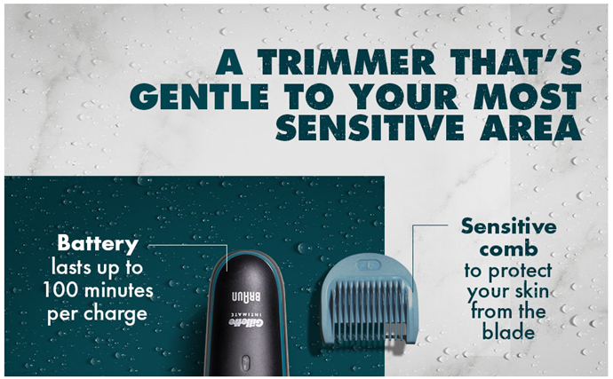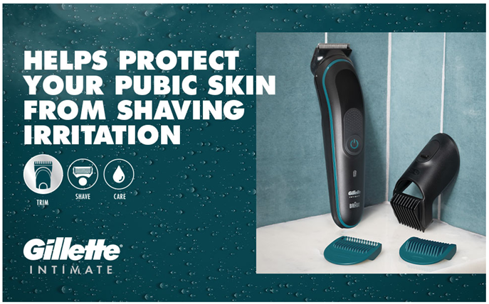 Meet Gillette's gentle and easy intimate shaving lineup that shows the proper respect for your region. Gillette Intimate Pubic Trimmer is Gillette’s first pubic hair trimmer for men, designed for gentle and easy grooming below the waist. Trim the hair with the 2 interchangeable skin-shielding guards. This electric pubic trimmer is cordless and has SkinFirst™ technology with closely spaced blades to reduce the risk to nick and cut the delicate skin. Powered by Braun, this electric men's pubic hair trimmer is equipped with a powerful Li-Ion rechargeable battery that lasts up to 100 minutes from a single charge. This waterproof pubic hair trimmer for men can be used wet or dry, so you can easily trim at the sink or in the shower, whenever you want, wherever you want. Gillette's intimate pubic trimmer comes with a charger, 2 lengths of interchangeable guards, a cleansing brush to keep hair out of your razor, and a soft carry bag. With Gillette Intimate Grooming, you have a routine so simple and easy that you won't need to plan ahead. For a complete intimate grooming routine, use the entire Gillette Intimate grooming line to help prepare, help protect pubic hair from shave irritation, and maintain your pubic hair & skin.