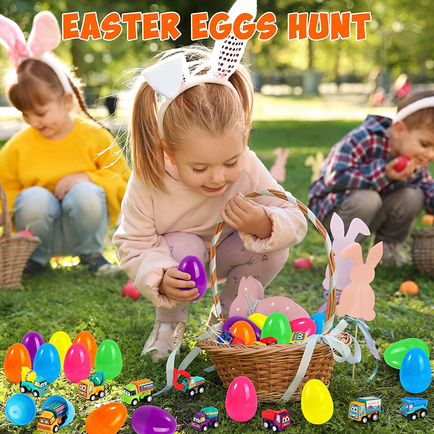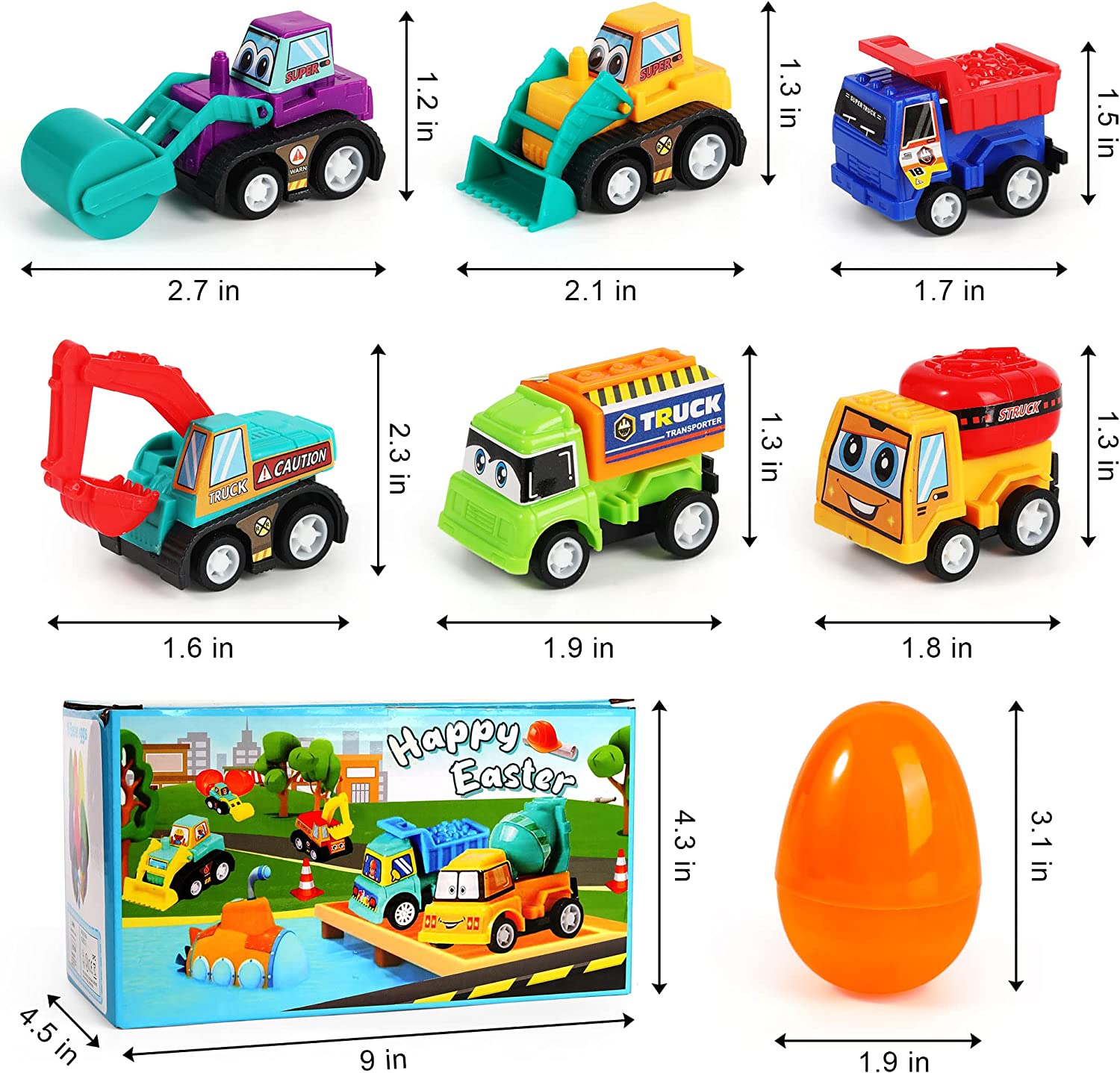 Prefilled with 16 different adorable pull-back construction vehicles. Top and bottom parts of eggs snap together to hide surprise inside. Kids will be delighted to discover the surprise in each Easter egg they hunt!