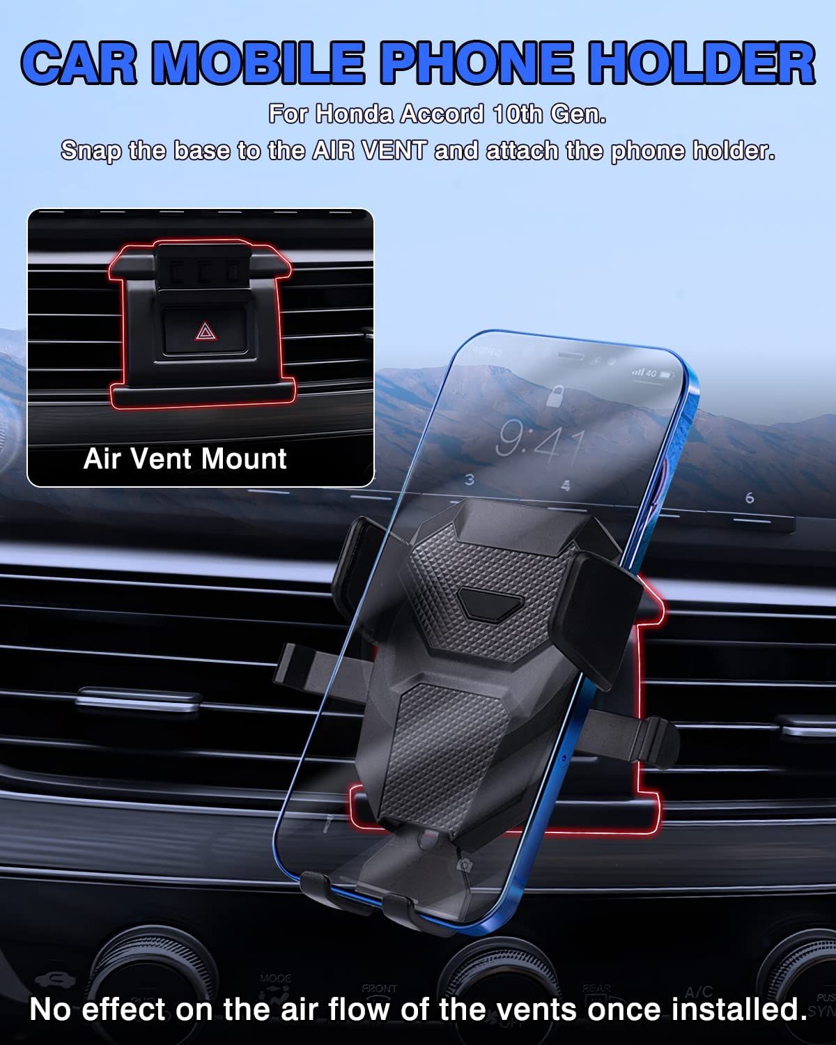 • 【Custom Fit for 10th Gen. Accord Accessories】The phone holder fits for Honda Accord 2018 2019 2020 2021 2022 Accessories. Special mount fits perfectly to the dash air vent, very secure, doesn’t obstruct buttons or any functions.