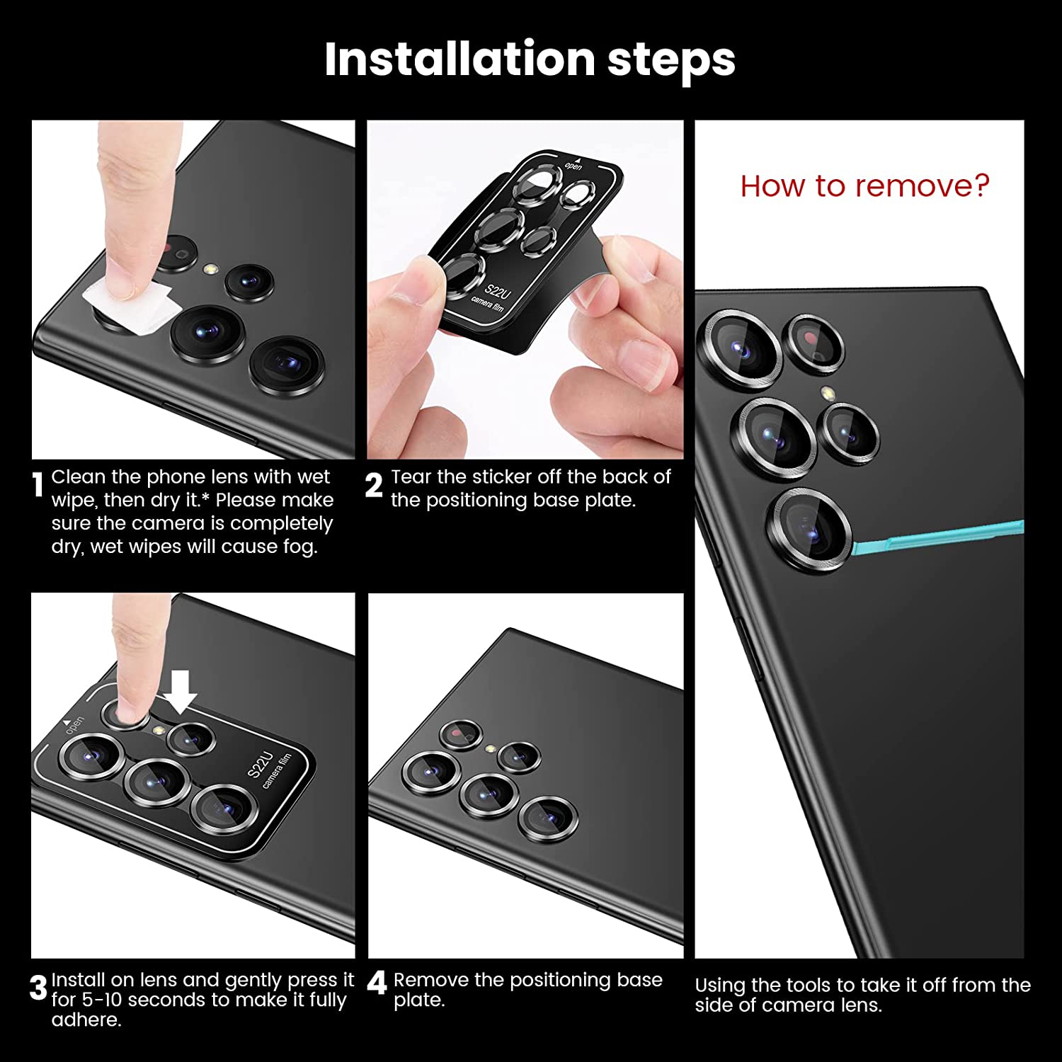 【Easy Installation】 The unique design of our S23 Ultra lens protector snaps precisely and securely into place. The adhesive is sticky firmly to the lens surface, don't worry about falling off. No residue will be left after removal.