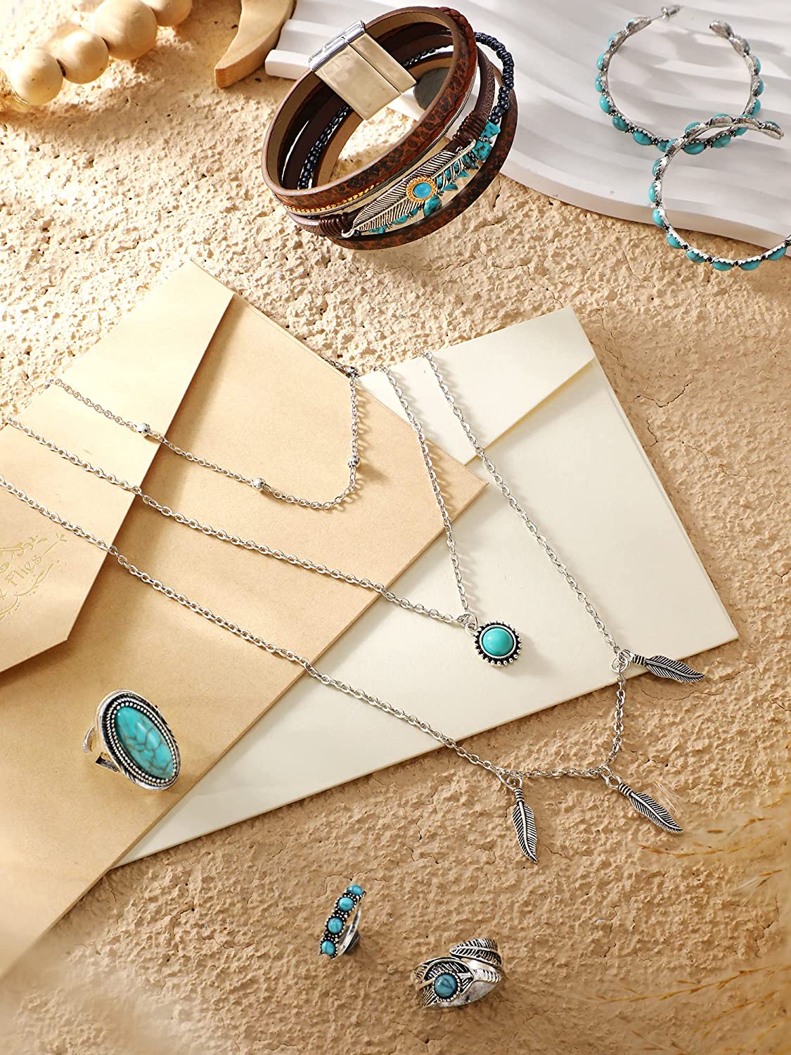 • Package Includes: the package will come with 6 pieces of turquoise jewelry for women, including a piece of turquoise faux leather layered bracelet, a pair of turquoise dangle earrings, a piece of turquoise pendant necklace and 3 pieces of turquoise finger rings, good collocation to meet your wearing, matching and replacement needs