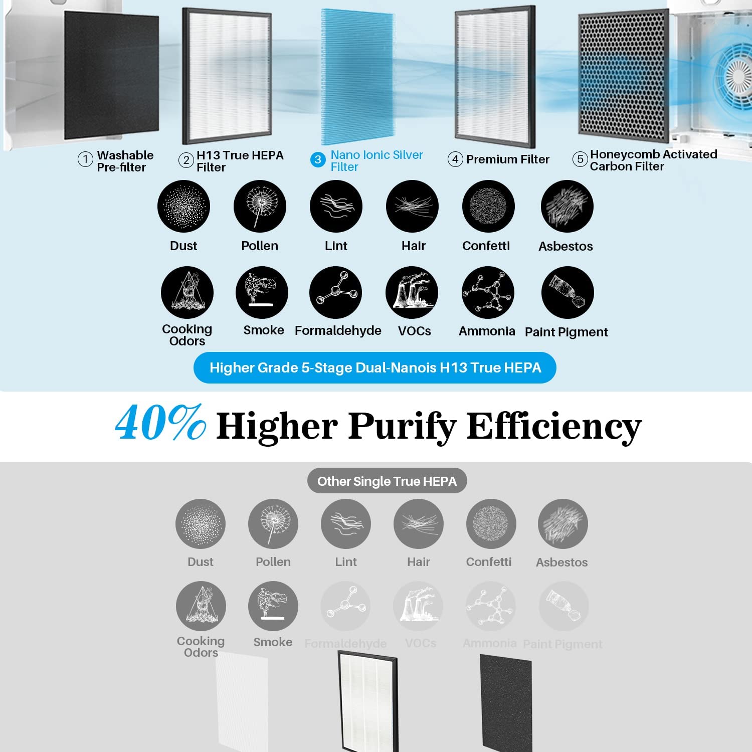 - Powerful 5-Stage Filtration System - Consists of 3 filters, including 2 in 1 H13 Dual Filter( Pre-Filter & H13 HEPA Filter), 2 in 1 Nanois Filter and Honeycomb Activated Carbon Filter. The purifier filter take advanced technology, which captures 99.97% airborne particles as small as 0.3 microns.