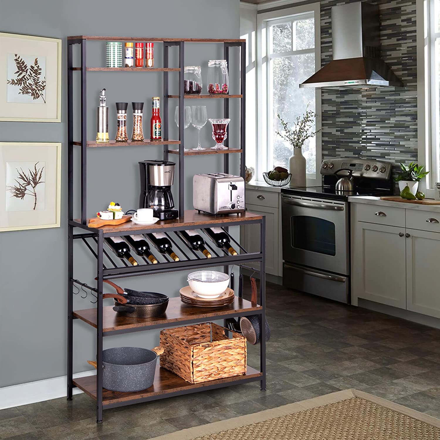 MAISON ARTS Bakers Racks for Kitchens with Storage, Microwave Stand Coffee Bar Station with 6 Hooks Wine Storage, Industrial Kitchen Shelf, Rustic Brown