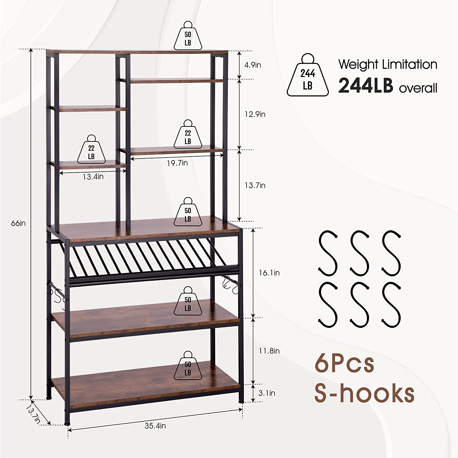 【Multiple Storage Space】Our kitchen storage shelf is not only a shelf for ovens, microwaves, coffee pots, toasters and mixers, but also an organizer for other items.The top is for various spice bottles while the bottom is for your tableware and cookware etc.Removable S-shaped hooks are perfect for hanging cooking tools such as spoons, pans and kitchen towels.
