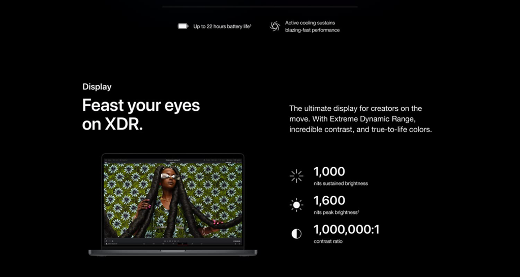 | Display | 16.2-inch (diagonal) mini-LED backlit Liquid Retina XDR display, 3456 by 2234 pixels with ProMotion technology for adaptive refresh rates up to 120Hz, and up to 1000 nits sustained (full-screen) brightness, 1600 nits peak brightness, True Tone technology, ProMotion technology for adaptive refresh rates up to 120Hz |