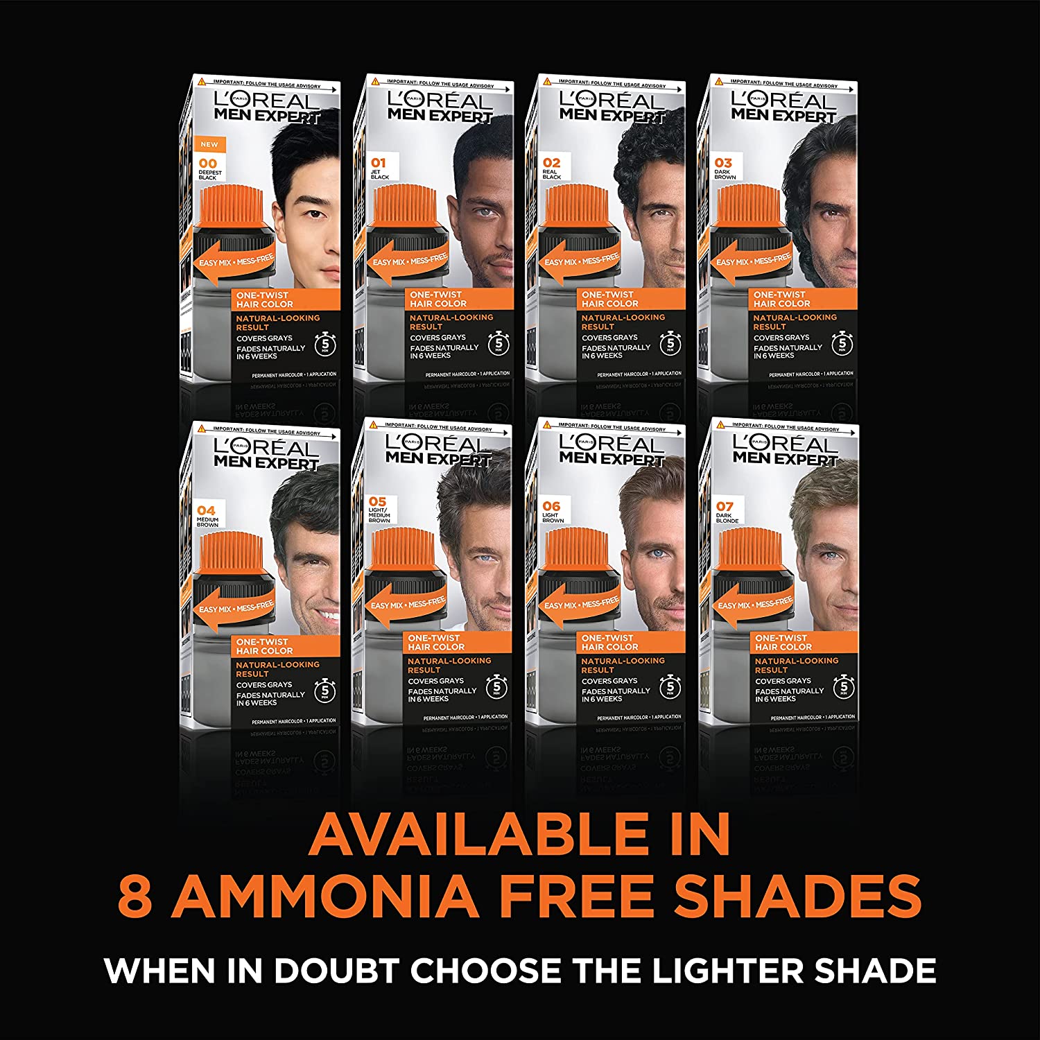 - L'Oreal has created a collection of 7 natural looking mens hair color shades, varying from dark blonde to jet black. A permanent, ammonia free hair color that targets gray coverage