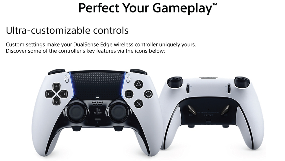 Get an edge in gameplay by creating your own custom controls to fit your playstyle. Built with high performance and personalization in mind, the DualSense Edge™ wireless controller invites you to craft your own unique gaming experience so you can play your way. Ultra-Customizable Controls: Changeable stick caps, remappable inputs and custom settings make your DualSense Edge™ wireless controller uniquely yours. Fine tune your aim by adjusting stick sensitivity and dead zones, set the travel distance of your triggers for faster inputs, and quickly swap between control profiles so you’re always ready for your next game. Mappable Back Buttons: Swappable back buttons can be configured to any other button input, so you’ve always got game-changing actions and essential controls at your fingertips. Plus, with two different styles of button to choose from, you can pick an input type that feels just right for your playstyle. DualSense™ Wireless Controller Features Built In: Enjoy all the immersive features of the DualSense™ wireless controller and our signature controller comfort. Experience varying force and tension at your fingertips with adaptive triggers and feel your in-game actions and environment simulated through haptic feedback. Replaceable Stick Modules: Play for longer with swappable replacement stick modules available to purchase separately. Haptic feedback and adaptive trigger features available when supported by game.