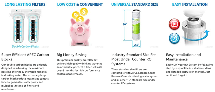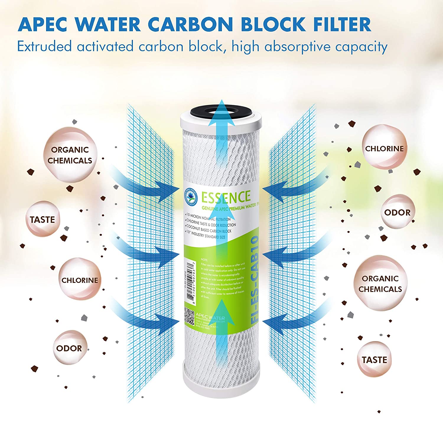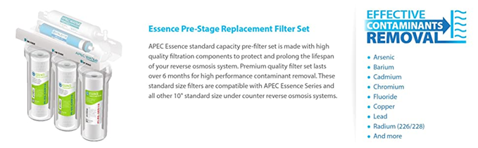 FILTER-SET-ES APEC Water essence standard capacity pre-filter set (FILTER-SET-ES) includes (1) sediment and (2) carbon block filters to protect and extend the life of the ro system 1st stage 5 micron polypropylene sediment filter to remove dust, particles, and rust 2nd & 3rd stage 10 micron extruded carbon block filters to remove chlorine, taste & odor high performance Replacement filters are compatible with all standard sized under counter ro systems.