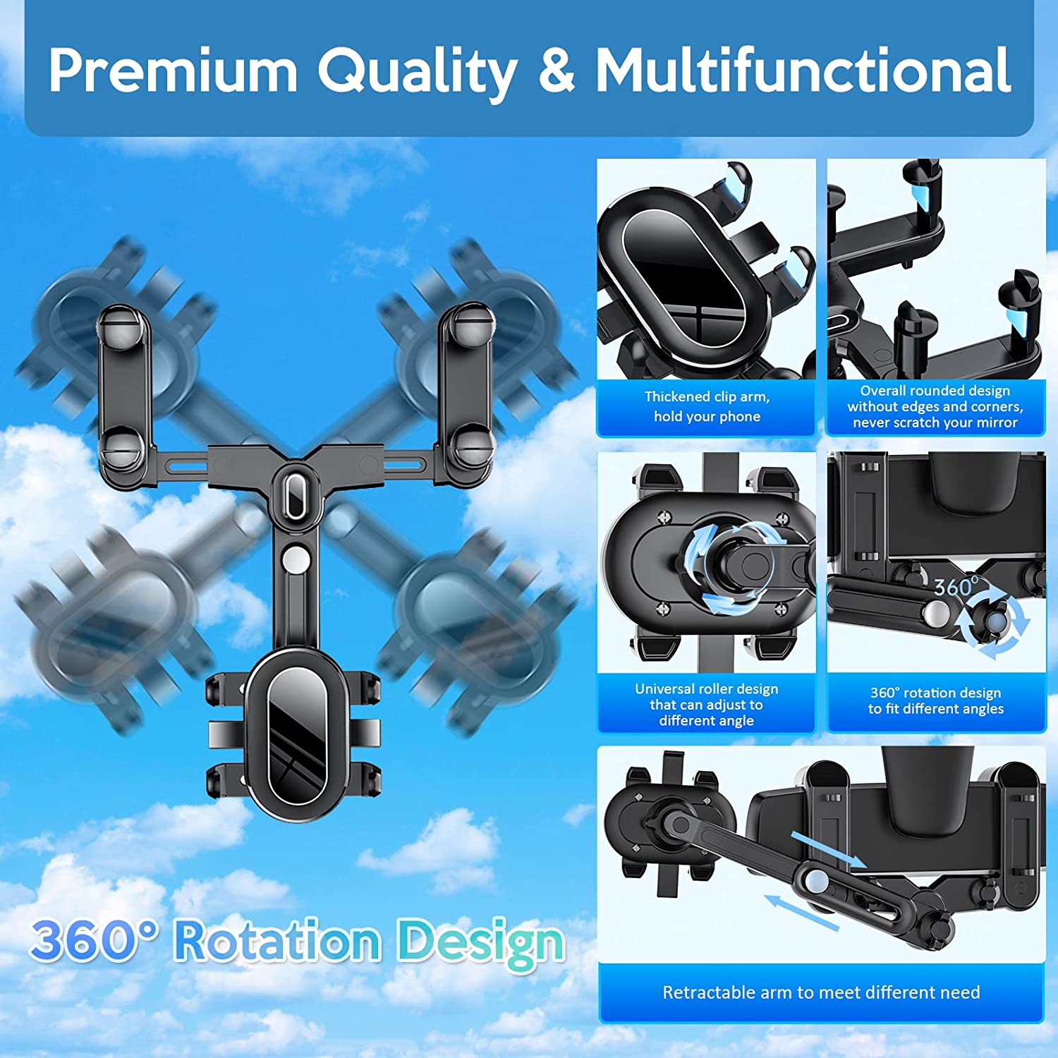 ?Rotatable and Retractable Car Phone Holder - The multifunctional car rearview mirror phone holder with 360° rotation design, you can put your phone in any direction (horizontal, vertical and more) as you like to enjoy the best driving experience. The arm length can be telescoped 0-5cm without obstructing your vision and ensure a safer travel for you and your family.