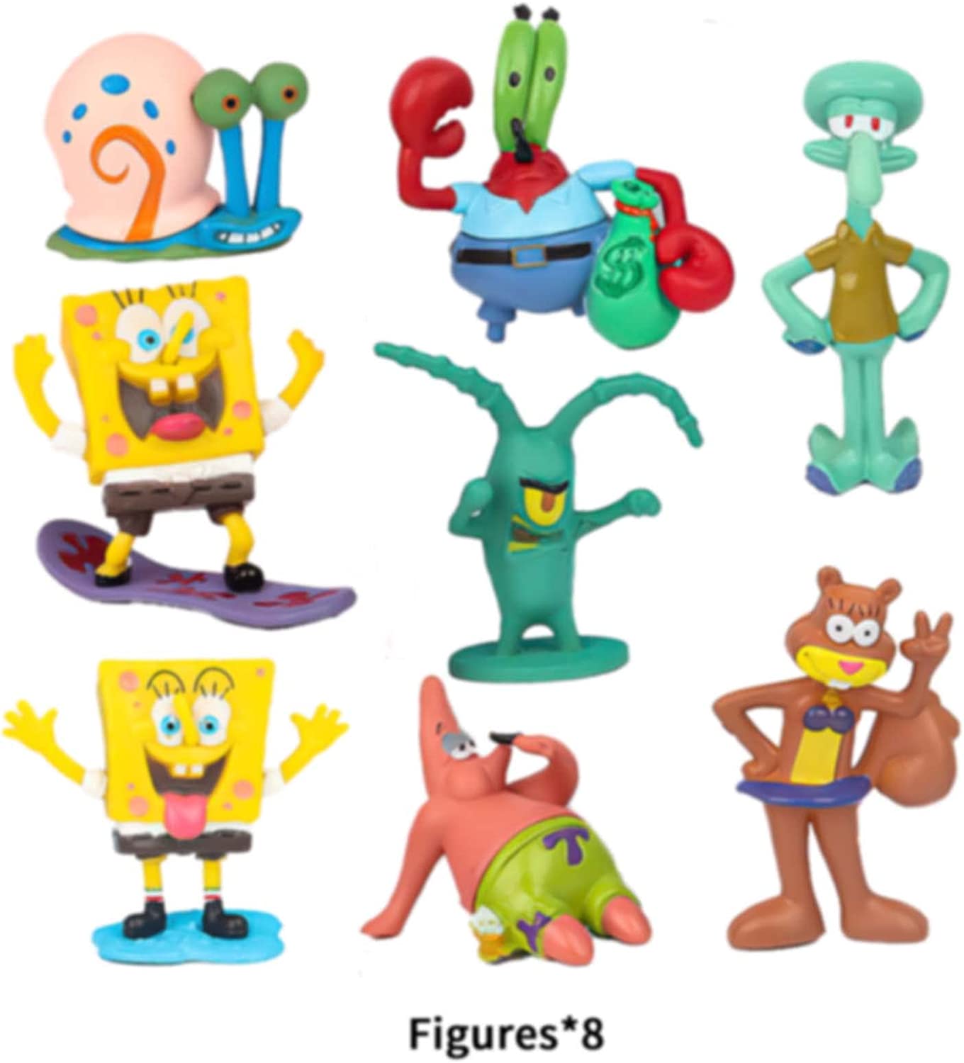 8 piece figurine playset with characters from the hit tv show... Spongebob Squarepants! These are great for cake toppers to decorate a cake, to give as birthday party favors, or to use as toys to play with! These are genuine toys. No retail box or retail packaging. All characters are individually wrapped in clear bags and sealed together in a clear OPP/CPP bag. Toys may have slight imperfections but doesn't affect overall appearance. We will ship in a box to ensure safe delivery! SUPER CUTE!! This Set includes: Spongebob - 2 inches Spondebob (surfing) - 2 inches Patrick Star - 1.5 inches Squidward - 2.5 inches Mr. Krabs - 2.25 inches Sandy Cheeks - 2.25 inches Gary - 1.5 inches Plankton - 2 inches