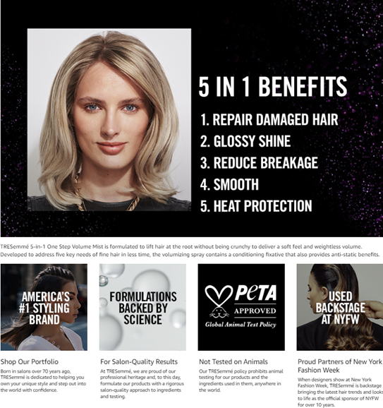 Looking for a professional quality hair styling product that creates volume and simplifies your hair routine? TRESemmé One Step 5-in-1 Volume Mist is a salon-quality hair mist that provides 5 benefits for transforming fine hair in one simple step. This innovative, multitasking hair care product instantly helps add volume, strength, heat protection to styling while also providing anti-static benefits with a light hold at the same time. Designed for fine hair, the hair volumizer will amplify your hair styling routine by delivering style and hair treatment all in one easy to use hair mist. Use this hair mist to create lift at the root without the crunch, delivering soft feel and weightless volume for fine hair. How to use: Simply spritz onto damp hair, focusing at the roots for lift. Blow dry with a round brush for extra volume. We've always understood that style is more than a look: it's a part of you. With our professional quality care, a world of style possibilities is yours to achieve. Every choice we make at TRESemmé, from the values we promote-such as not testing on animals and being PETA-approved-to the stylists we work with, down to the carefully selected ingredients we use, are made with intention and inspired by the latest trends and style. Because 70 years on, we believe in the power of style. So tell your story, land that job, make your mark – and achieve your aspirations with confidence. With TRESemmé, your style can match your ambition.
