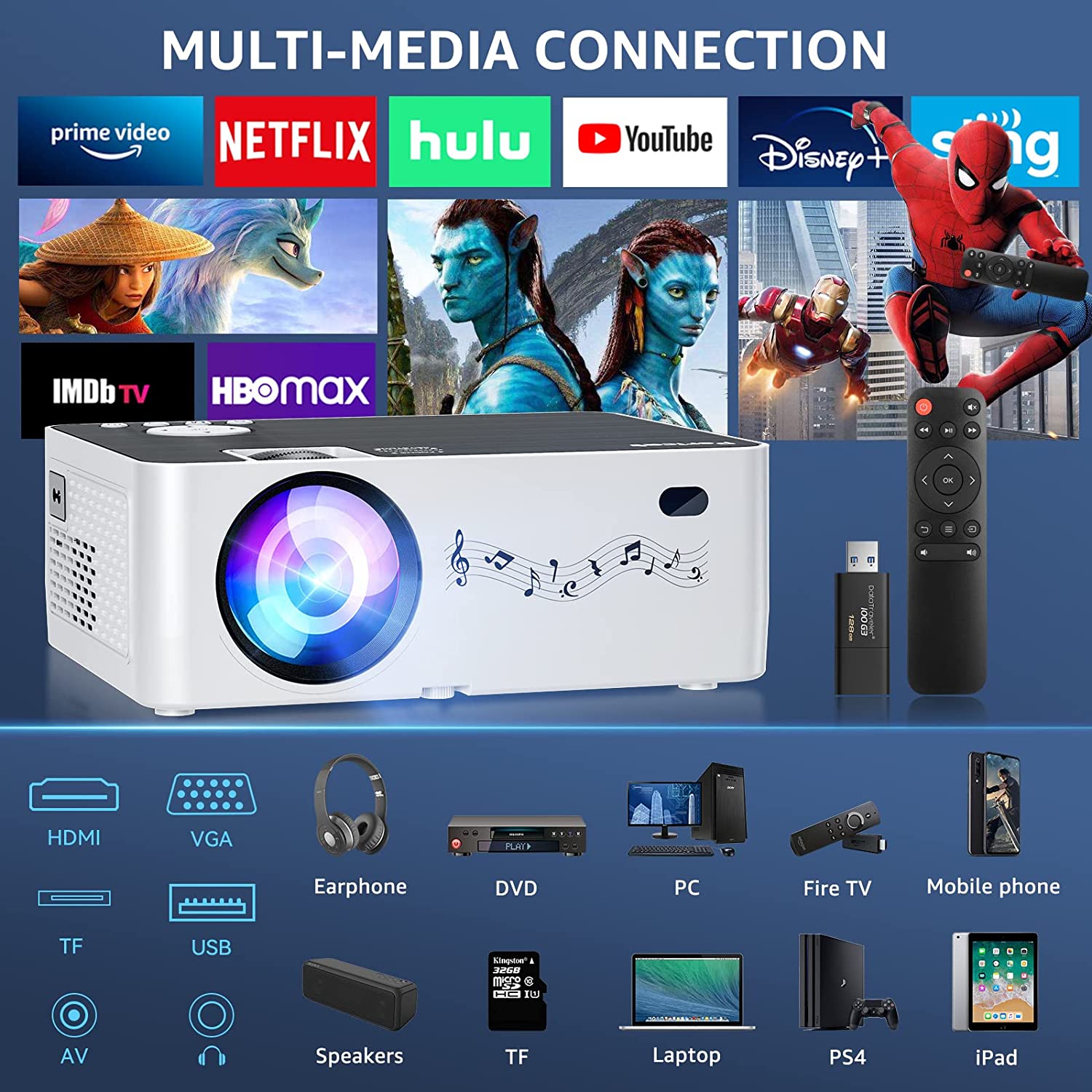 | Special Features | ①5G+2.4G WiFi and Bluetooth 5.1 ②Native 1080P Full HD Resolution 4K Supported ③350" Giant Display ④Dual Buit-in 2 Speakers ⑤Support Table, Tripod, Ceiling Installation ⑥Compatible with TV Stick, Phone, PS5, Laptop, PC ⑦Support Wired Connection with HDMI, VGA, USB,AV ⑧Support Keystone & Zoom Function |