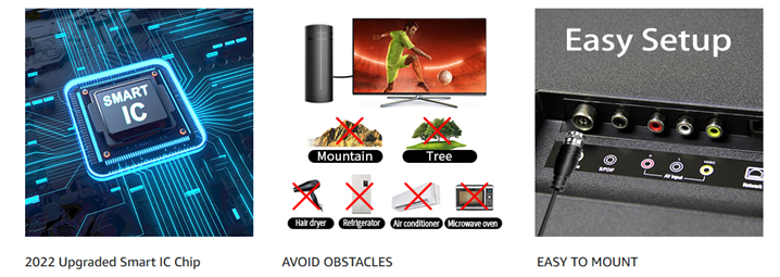 - ?【Up to 580+ Miles Range Reception 】: This hd tv antennas built-in the most advance Smart IC Chip and Powerful Amplifier Signal Booster. Using unique technology that optimizes signal transmission and avoids interference from other signals, it greatly increases the received signal range by up to 580+ miles, allowing you to enjoy the most TV channels for free.