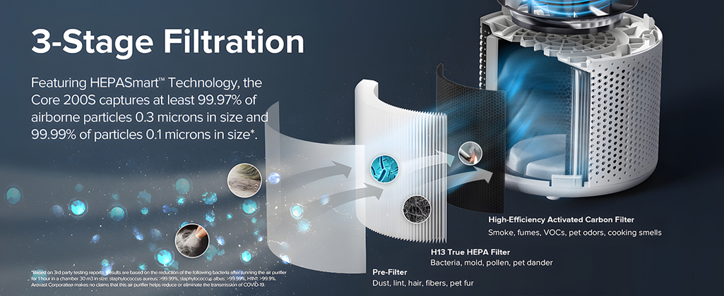 • IMPROVED FILTRATION: While the ultra-fine Nylon Pre-Filter and High-Efficiency Activated Carbon Filter capture large particles and absorb odors and fumes, the H13 True HEPA Filter captures 99.97% of airborne contaminants 0.3 microns in size, ridding your environment of dust, pollen, pet dander, mold spores, and more